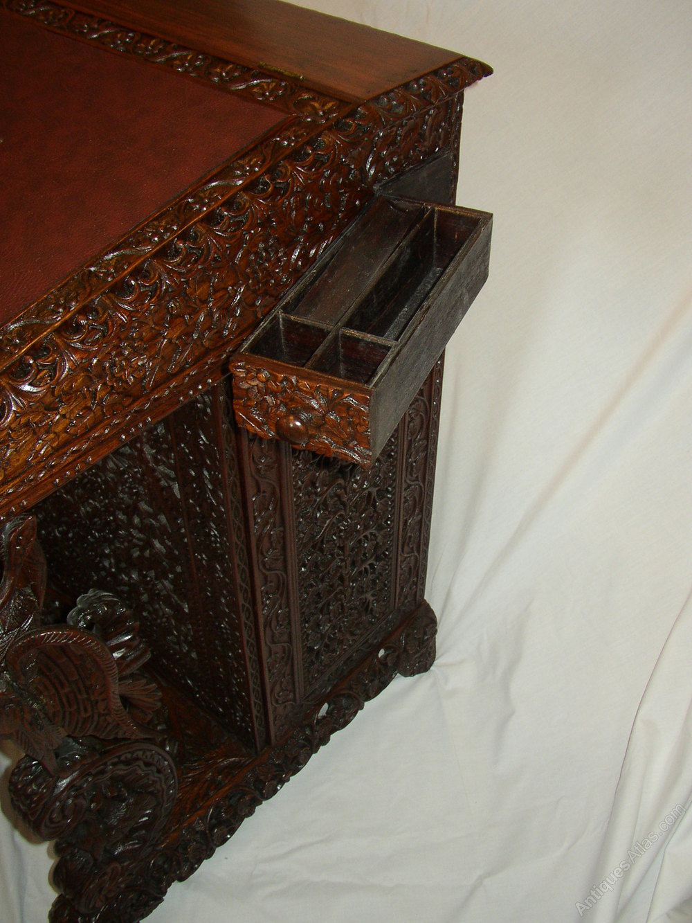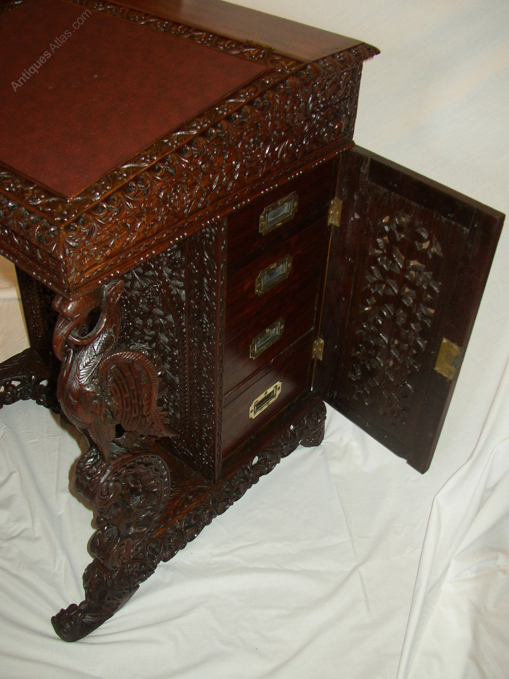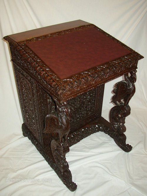 Fantastic Indian rosewood davenport extensively carved with flowers eagles columns with serpents in their talons.