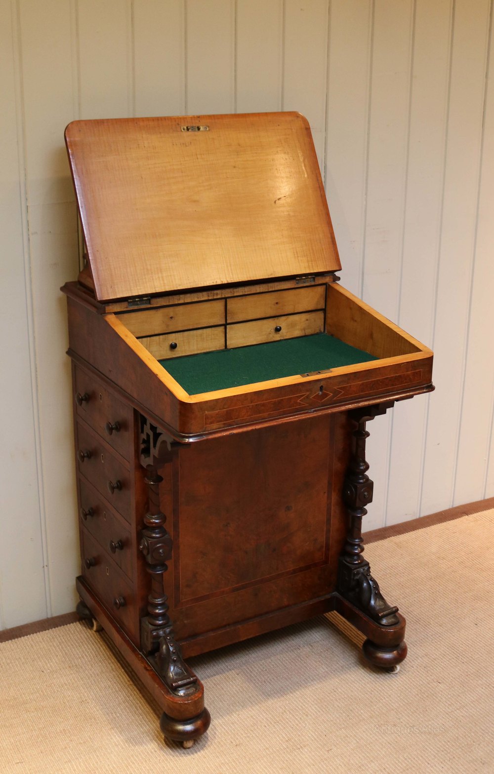Victorian burr walnut Davenport having a leather writing slope which lifts up to reveal a satinwood interior with two drawers behind which is a stationery compartment. Having four drawers to one side and a further four dummy drawers to the other raised on bun feet with original ceramic castors