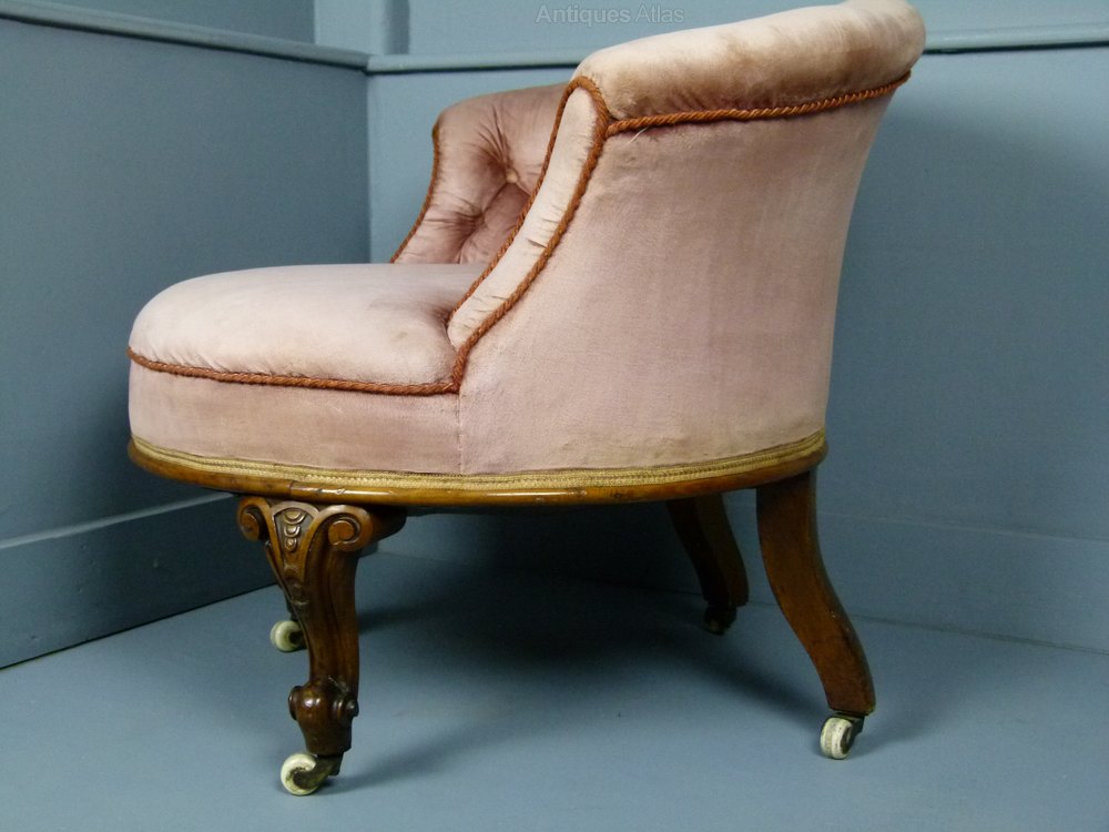 The circular seat and button-back are upholstered in a pink velour fabric, with a contrasting darker pink piping.