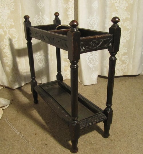 The stand is made in Oak, it has carved decoration around the top and the base with turned uprights, the top is divided into 2 sections and will hold both Walking Sticks or Umbrellas, it also has the original metal drip tray