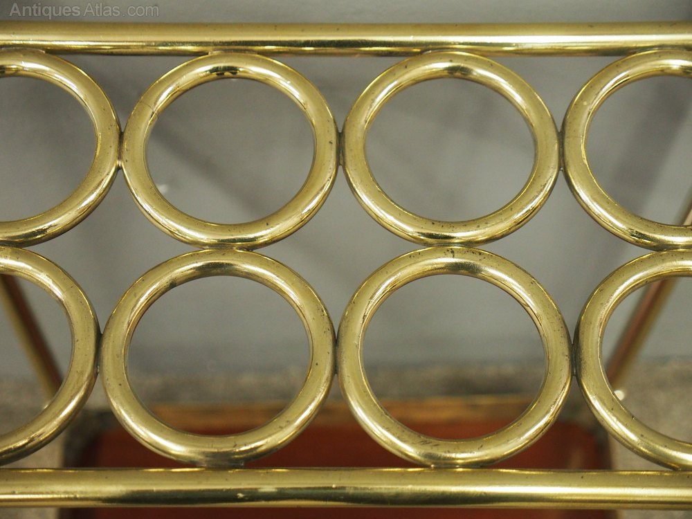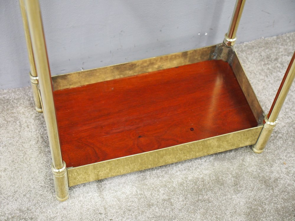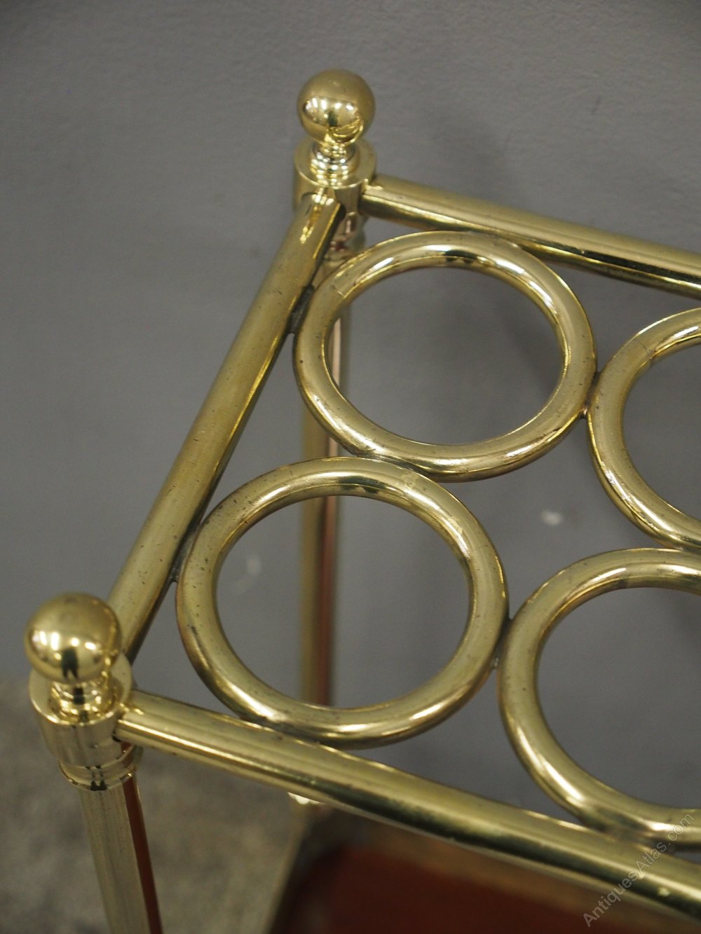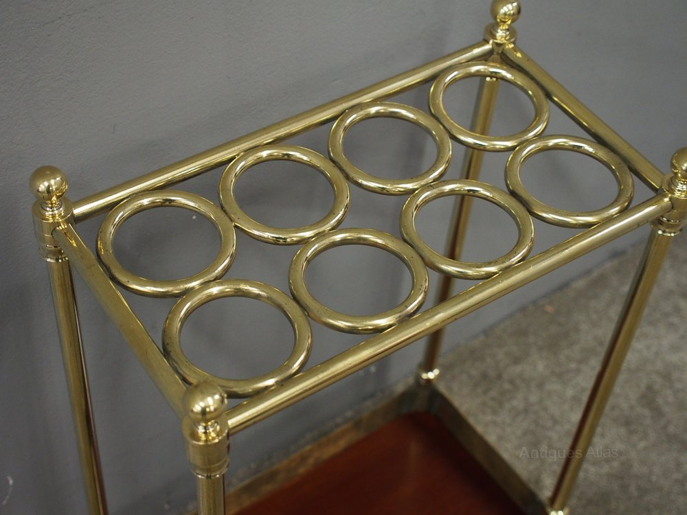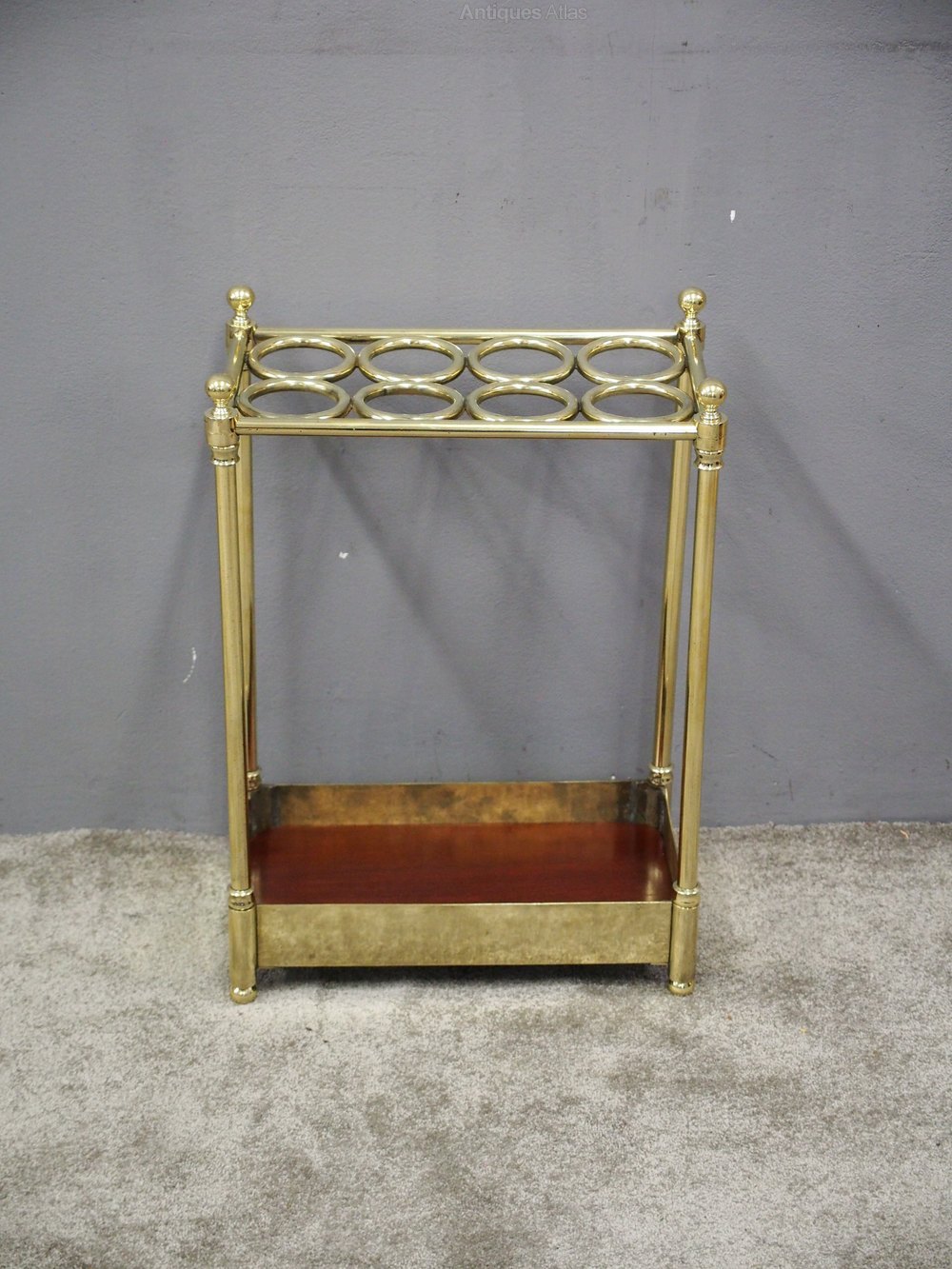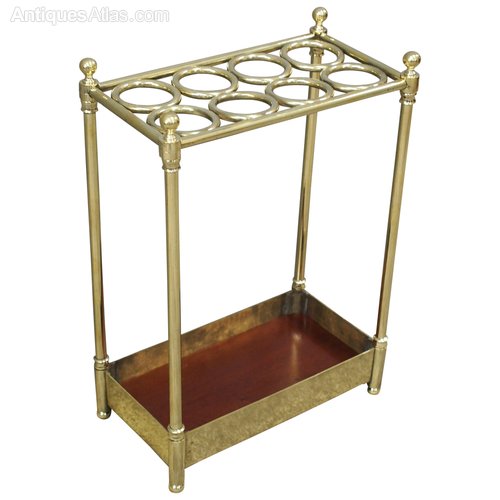Circa 1880, unusual and stylish cast brass and mahogany stick stand. The rectangular shape with 8 circular sections for storing sticks or umbrellas, in 4 circular columns and connected stretchers, capped by finials. A deep brass drip tray with a mahogany base, finishing on 4 circular cast brass feet.