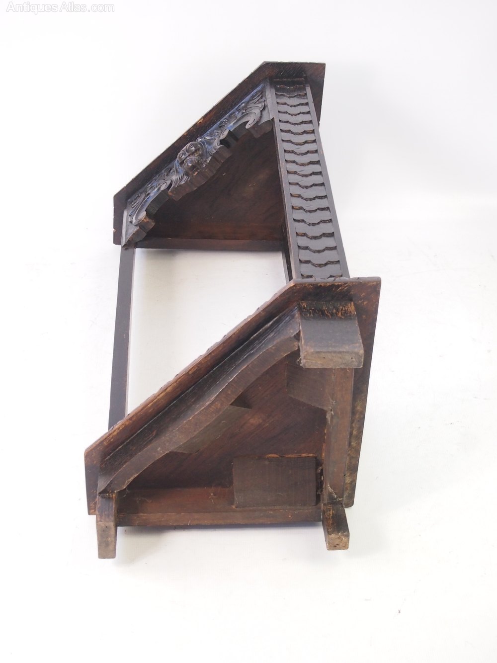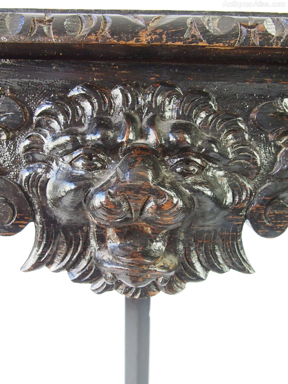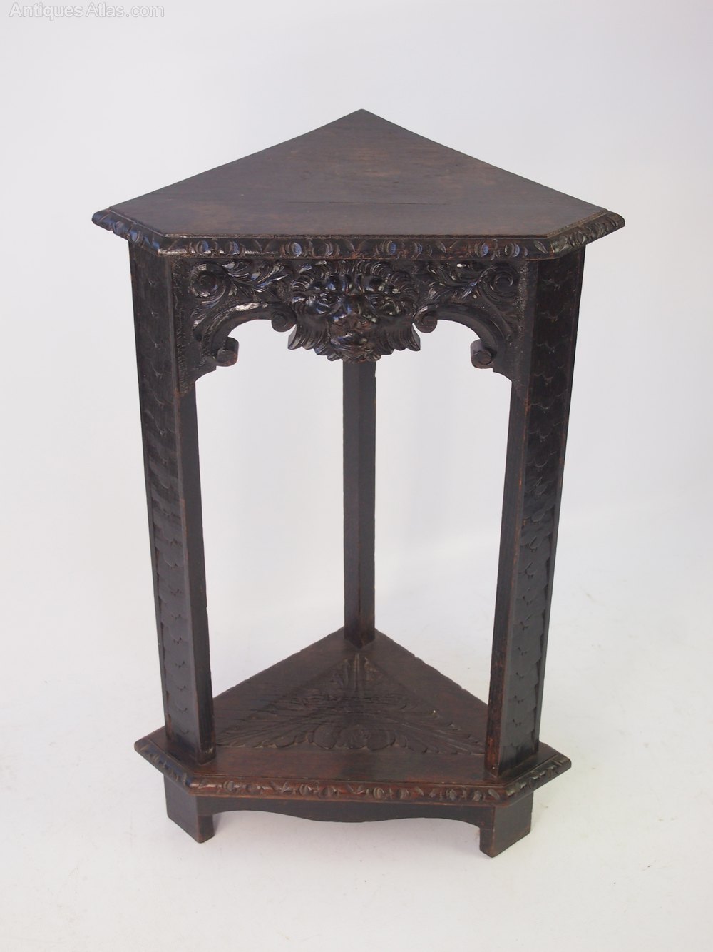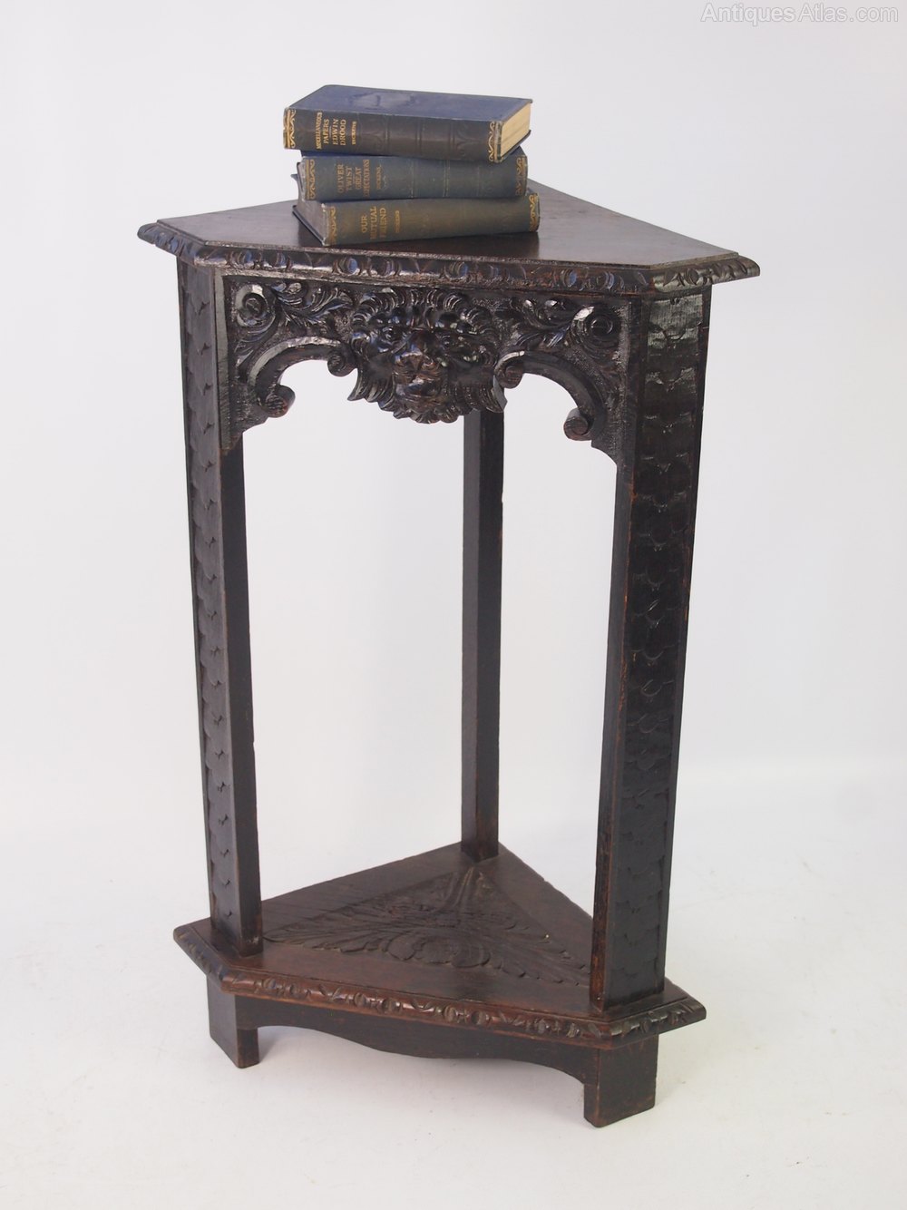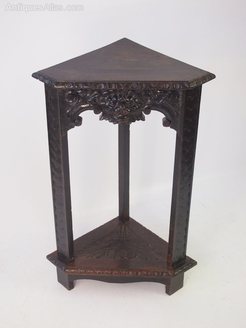 A very decorative antique Victorian Gothic Revival corner stand or jardiniere in oak dating from circa 1890. With elaborately carved lions head to the front pelmet, the side supports and edges are also carved. It has a leaf carved lower tier and shaped pelmet to the base.