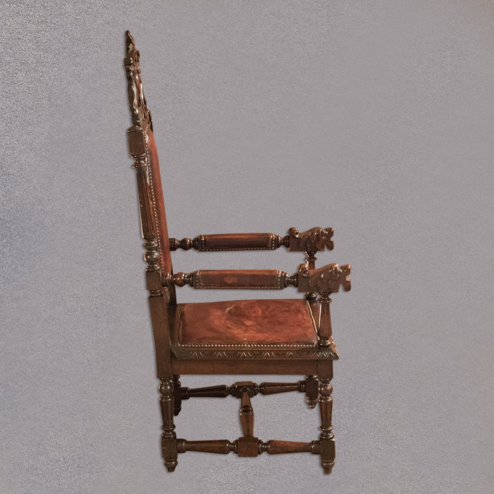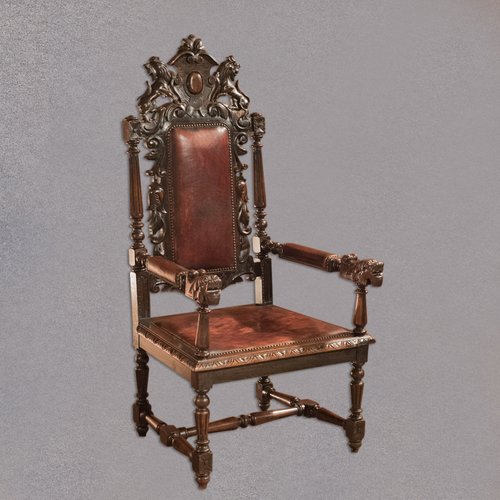 Adorned with heraldic overtones, this chair is generously proportioned and heavily carved in English oak and upholstered with an ox-blood leather hide.