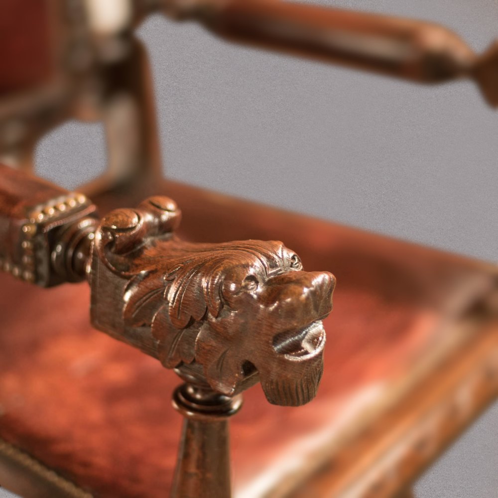 Raised on turned legs united by an 'H' stretcher, the seat rail is topped with a carved apron around the central leather seat panel. The padded arms sit upon turned risers and terminate in stylised lion masks with foliate manes.