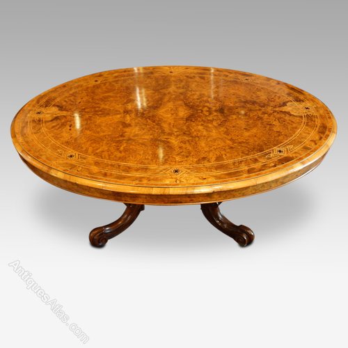 This Victorian inlaid burr walnut coffee table was made circa 1860.The top of oval shape, with superb burr walnut and end grain walnut moulding around the edge of the top. Having end grain moulding is always a sign of superior quality construction, finishing it this way is a more time consuming skilled and expensive process.