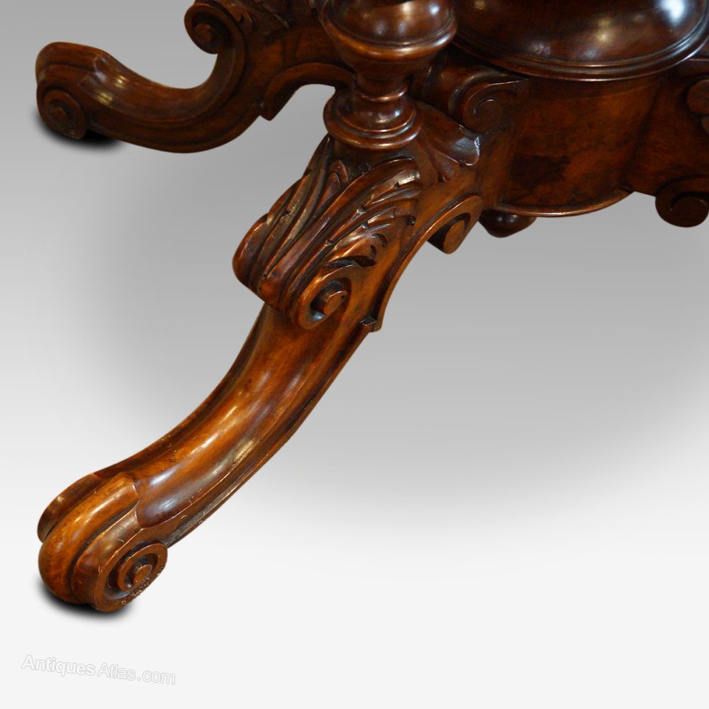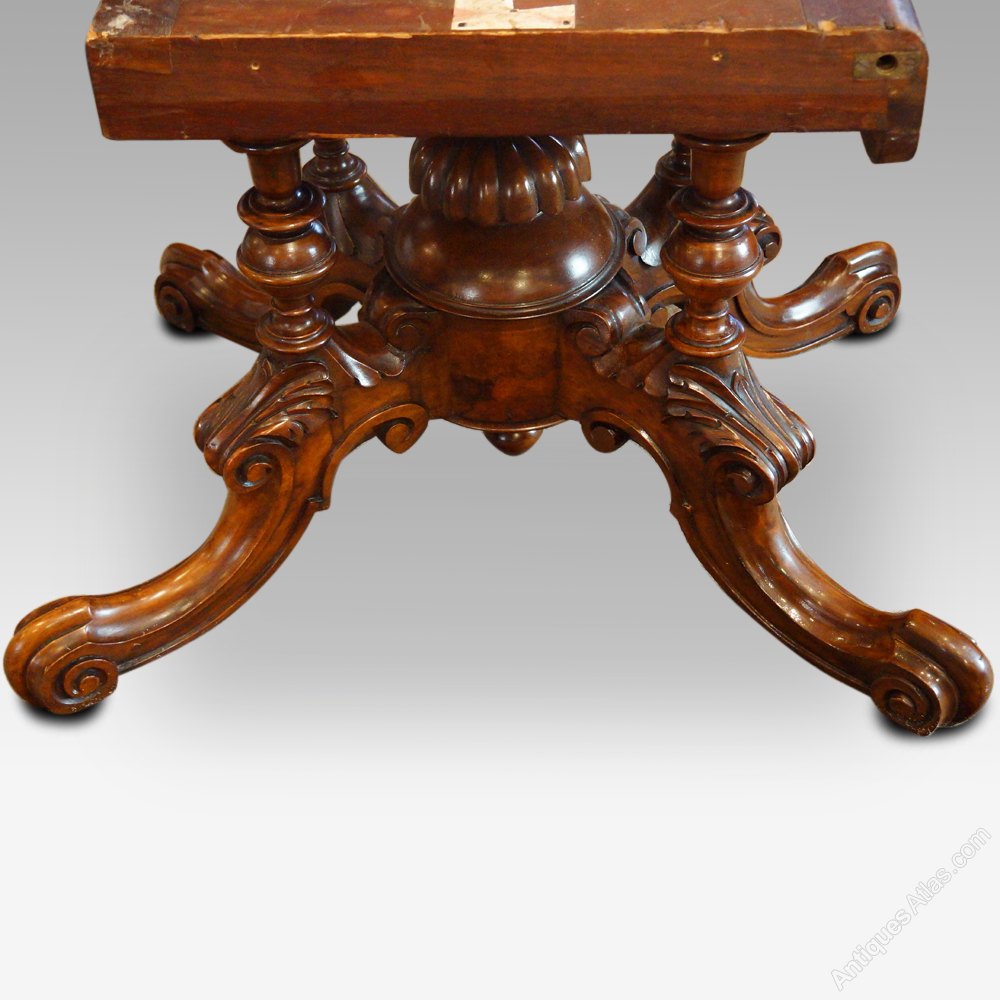 The solid walnut base has 4 cabriole legs with the original china castors under coming off the quadruple column platform base.