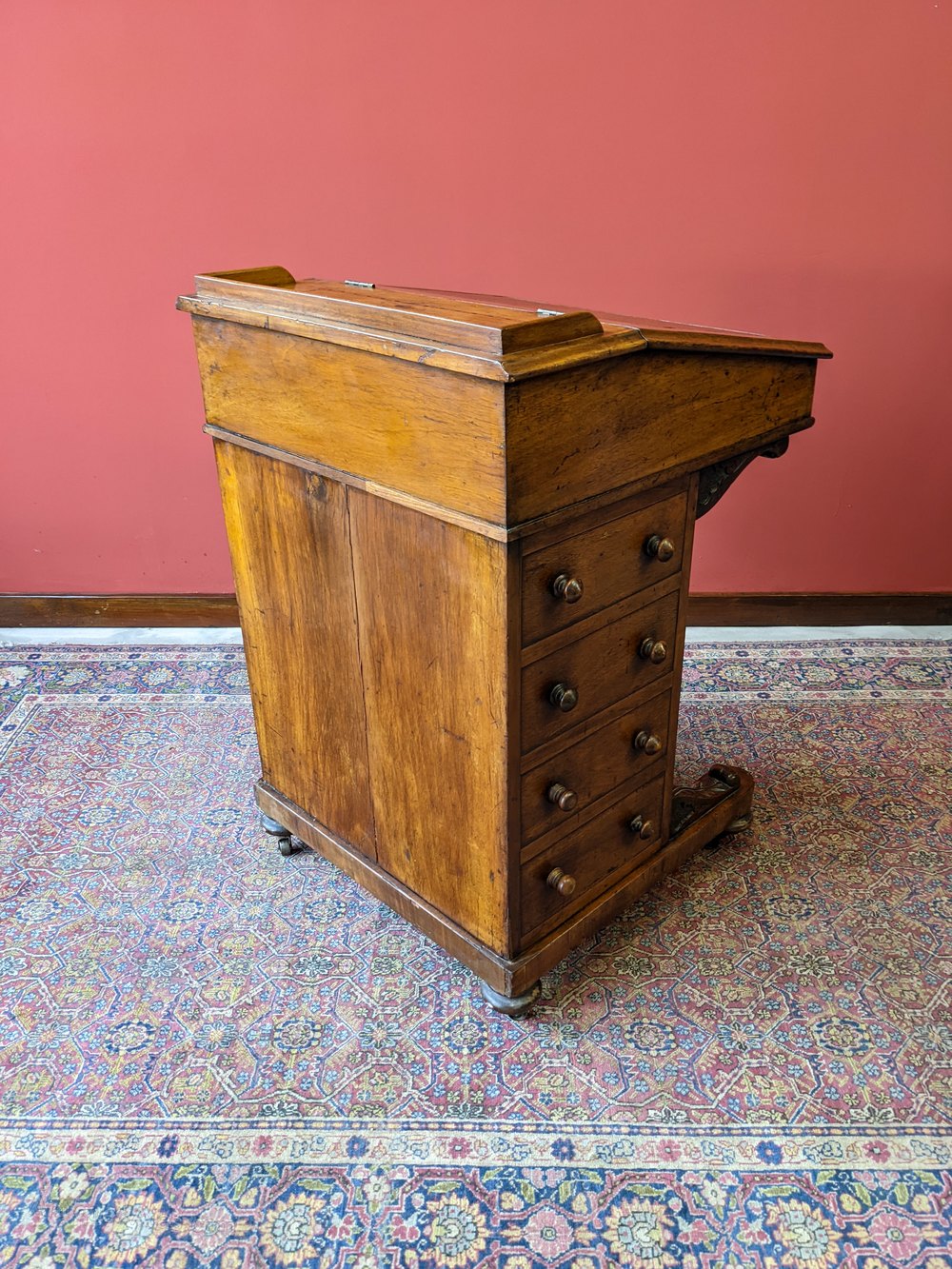 Very good general condition, with lots of attractive aged surface wear. There is an aged split to the front underside of the desk and the back panel but these are merely aesthetic and not unattractive. The maple lined desk interior is in good shape with just some old ink stains.