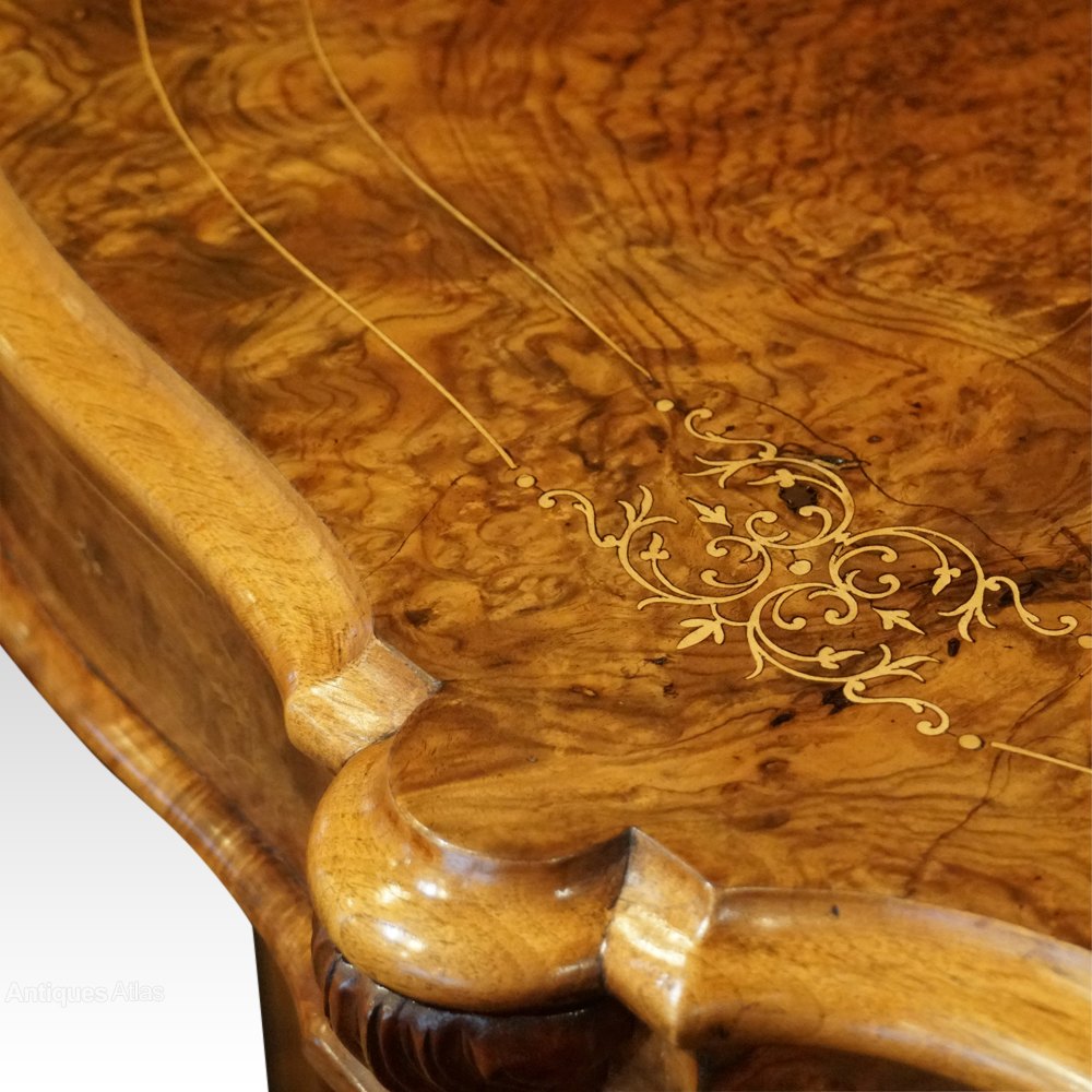 The shaped walnut top with box stringing and attractive patterns at the corners.