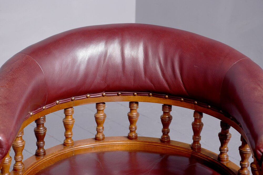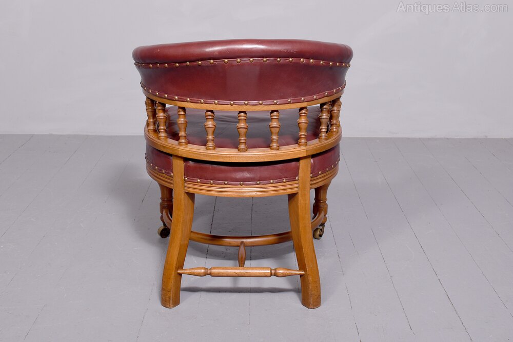 Circa 1880, Quality Large Victorian Leather Covered Walnut Desk Chair The horseshoe-shaped back upholstered in brown leather with a lovely degree of wear, supported on spindles and turned supports in front above the generously sized, serpentine-front leather upholstered seat over a fluted seat rail. Over ring-turned legs with brass casters in front and crinoline stretcher to the outswept rear supports—lovely condition with a nice colour and patina.