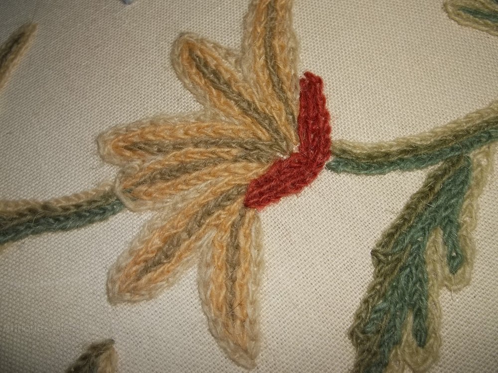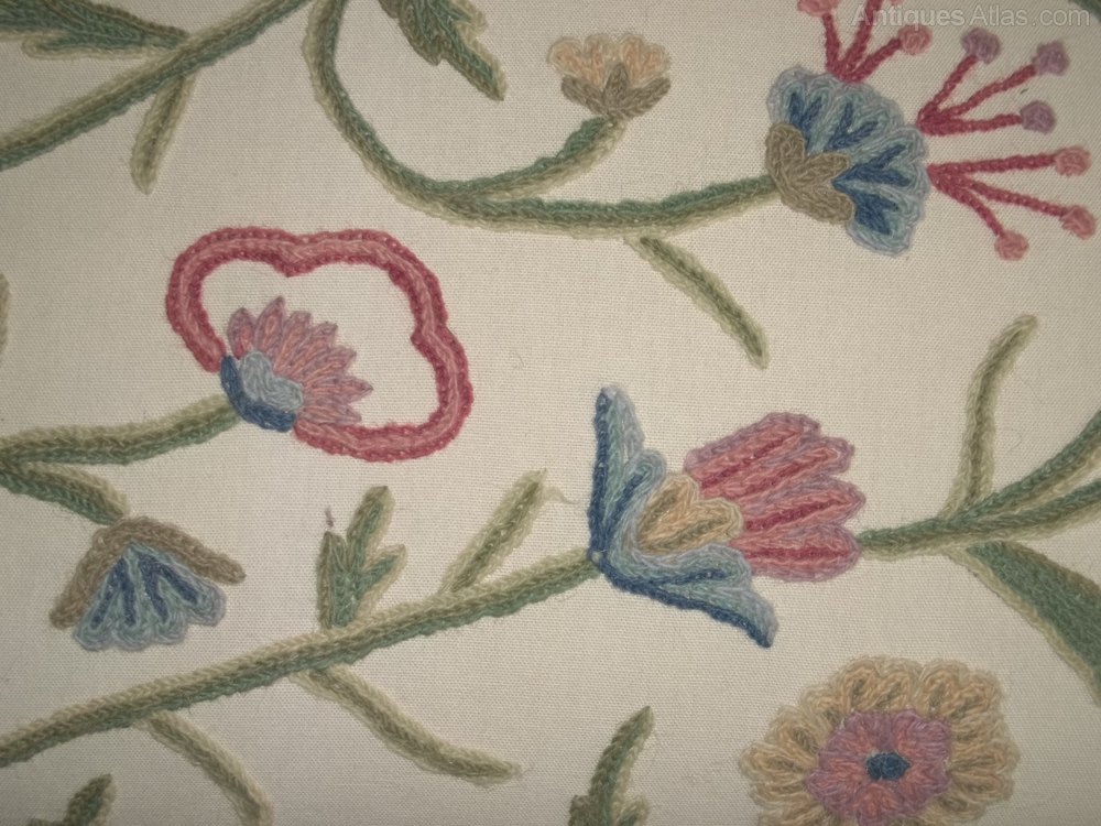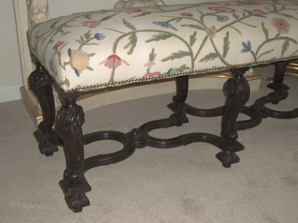 Late 19th Century long stool/or window seat in very good original condition and upholstered in Jacobean style crewel work fabric. Six finely carved legs and X frame stretchers.