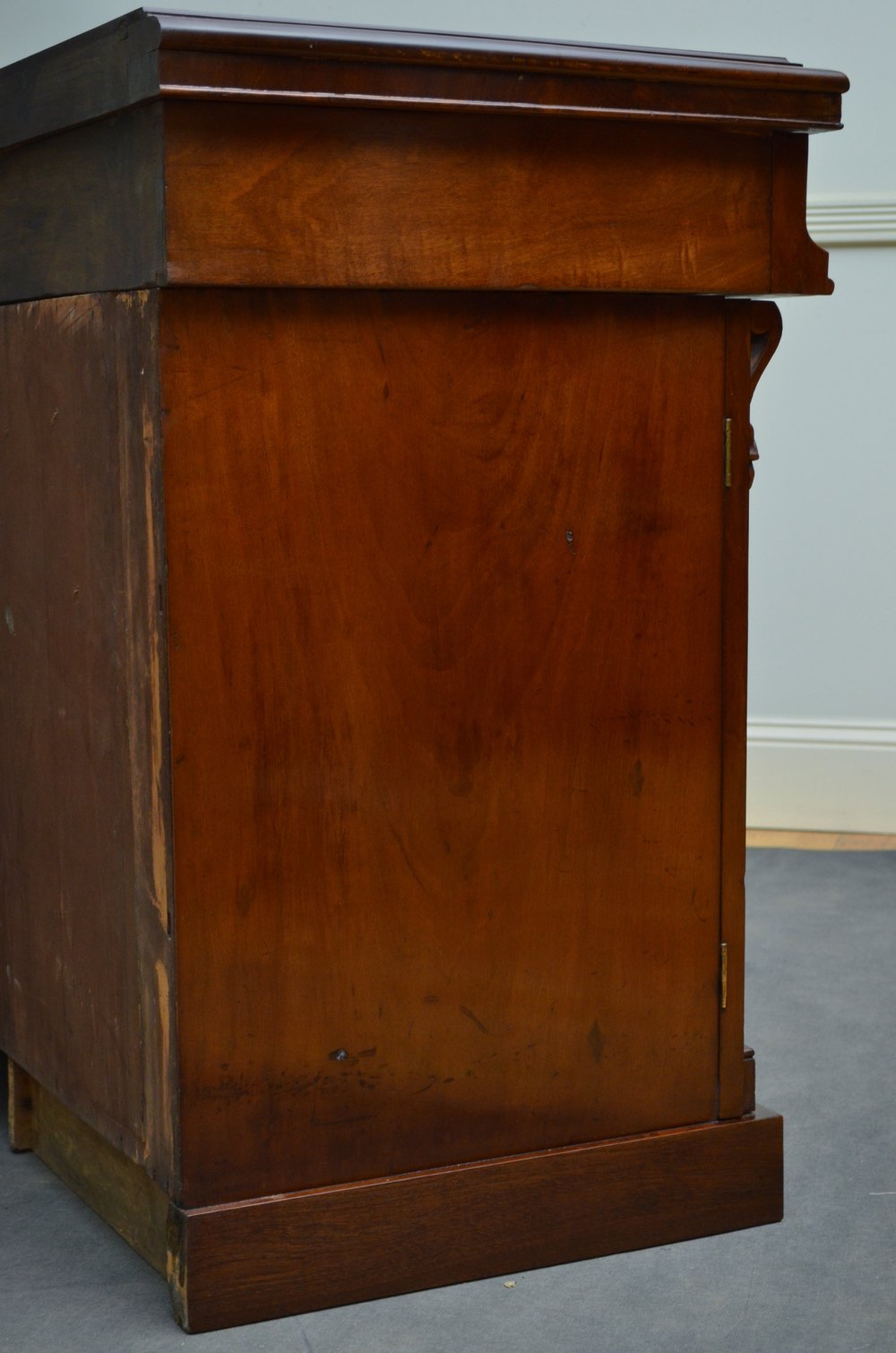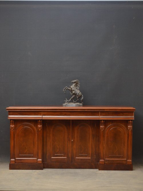 Sn4310 Victorian 4 door sideboard in mahogany, having figured top with moulded edge above 3 shaped, mahogany lined drawers and arched and panelled cupboard doors fitted with working lock and a key and enclosing a shelf, all flanked by further cabinet doors enclosing sliders and deep drawers, decorated with fine pilasters and drop carvings, all standing on plinth base. This antique sideboard is in home ready condition. c1870