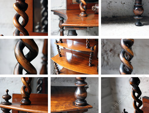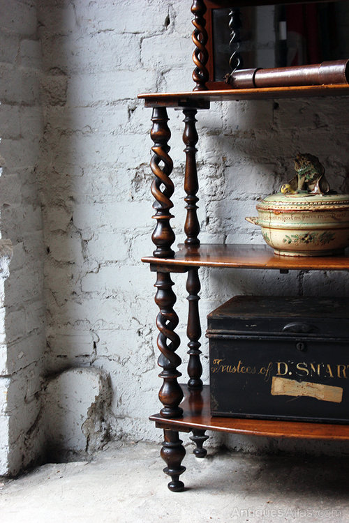 The étagère has only been waxed by us and remains in desirable original condition showing a beautiful aged mahogany patina and colour. The mirror plate is all original and has some attractive foxing to parts. She is structurally sound in the most part, though her feet are a little skewed and have traces of old worm but she still stands well enough for a lightweight piece. There is some slight movement shelves to each tier but again nothing that one wouldn’t expect. The spiral twists and shelves all with wear and a good deal of patination. The acorn finials to the top shelf may be later.