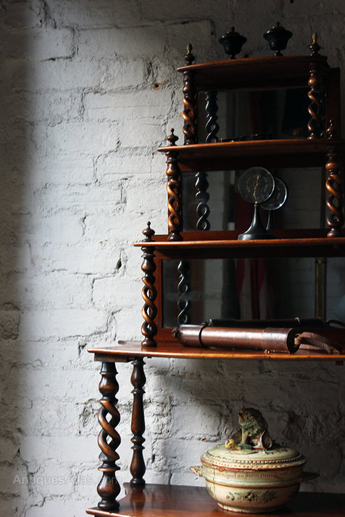 The fine mahogany étagère having six graduated tiers of three mirror backed tiers above two shaped shelves, raised and divided by well turned open pierced spiral turnings and baluster supports, the top shelf with acorn brass finials, the whole sitting on turned feet and surviving from the early Victorian period.