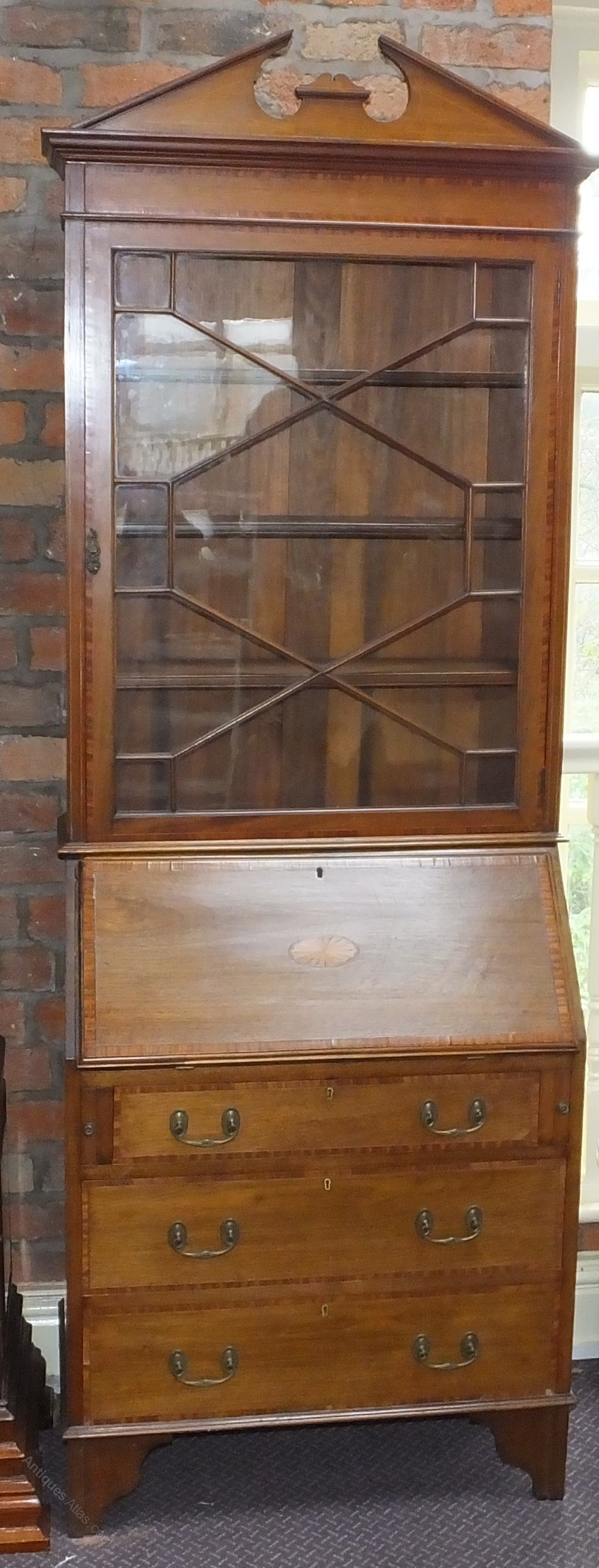 This is a Victorian Mahogany and satinwood secretaire with a three drawer base unit and bookcase above.
