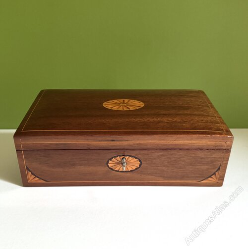 An elegant Victorian mahogany box, lined in original turquoise blue satin, made in England in the 1880s. Originally a sewing or work box, it has a beautiful fan motif in contrasting satinwood on the lid and front, and a working lock with its original decorative key. It would make a fabulous antique jewellery or keepsake box, and a perfect gift for a man or woman. The original black leather is on the base to protect your table top. .