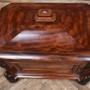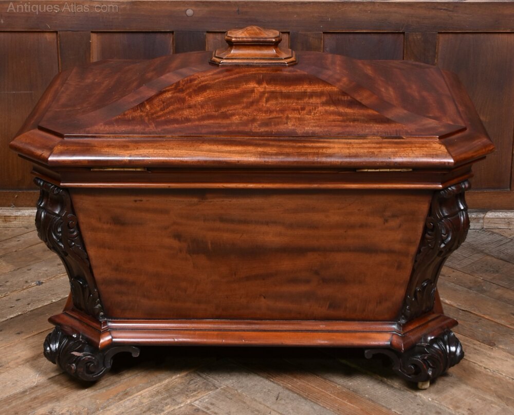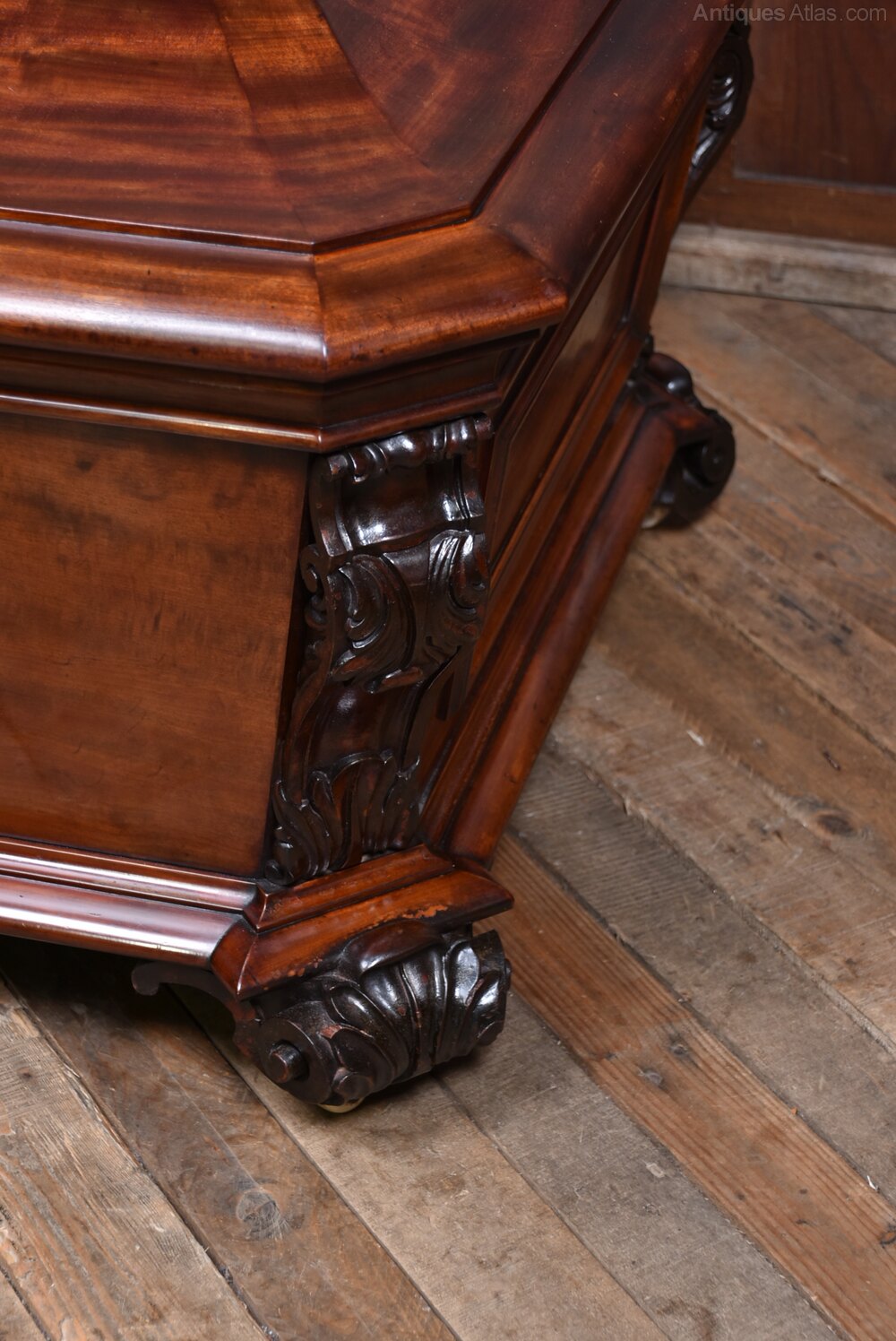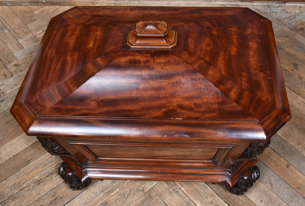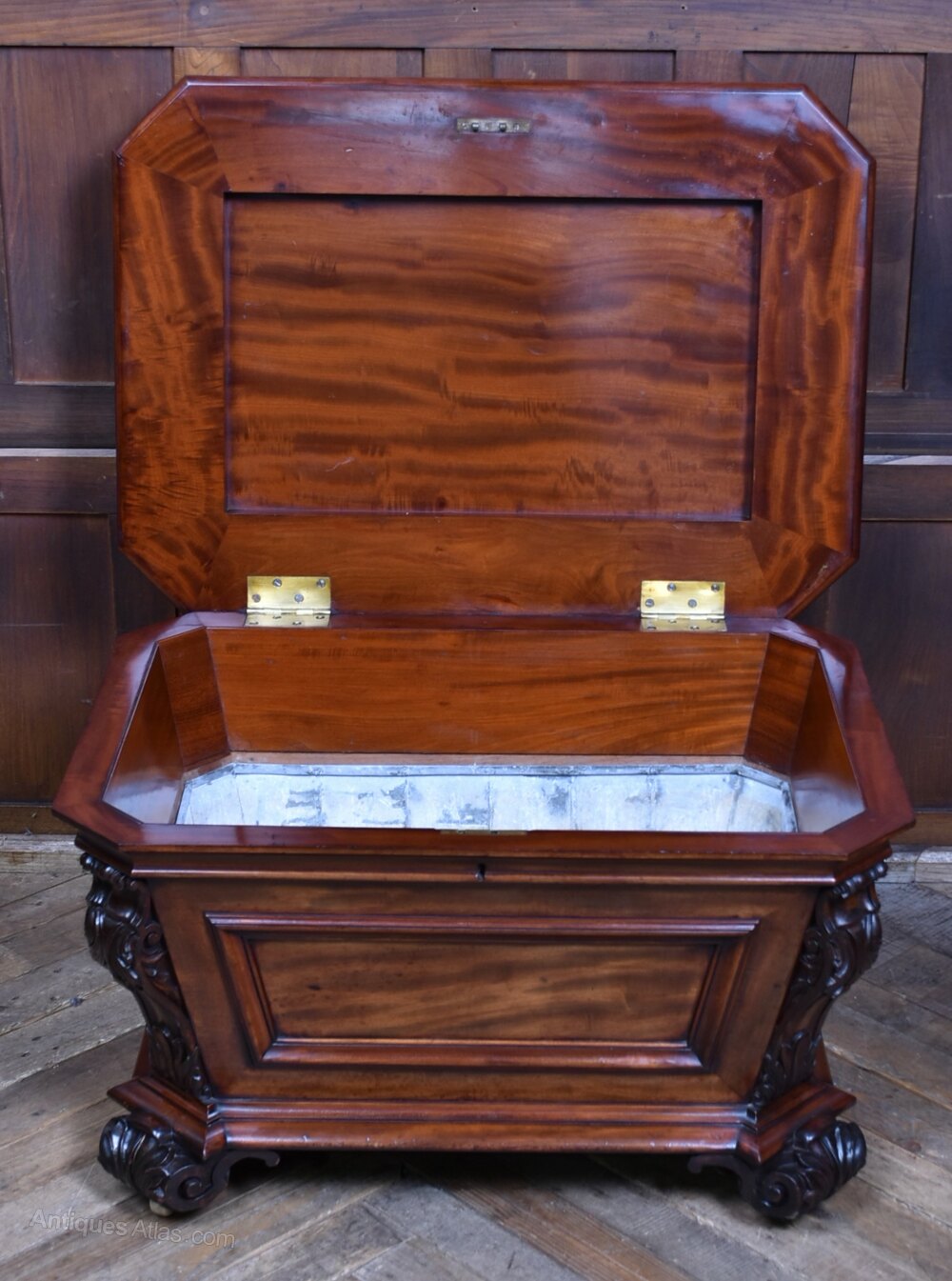 A striking and generously proportioned Victorian mahogany cellarette, crafted in classic sarcophagus form and retaining its original zinc-lined interior. The hinged lid, opens to reveal ample space—ideal for storing ice, bottles, or party essentials. The front is adorned with a beautifully moulded panel, while the canted corners are enriched with finely carved detailing that continues onto the elegant feet, adding visual drama and balance. Rich in tone and displaying wonderful grain throughout, the piece offers a warm patina and tactile appeal. In excellent antique condition, with only minor marks and wear consistent with age and use—this is both a functional piece and a stylish talking point, perfect for entertaining or enhancing a refined interior.