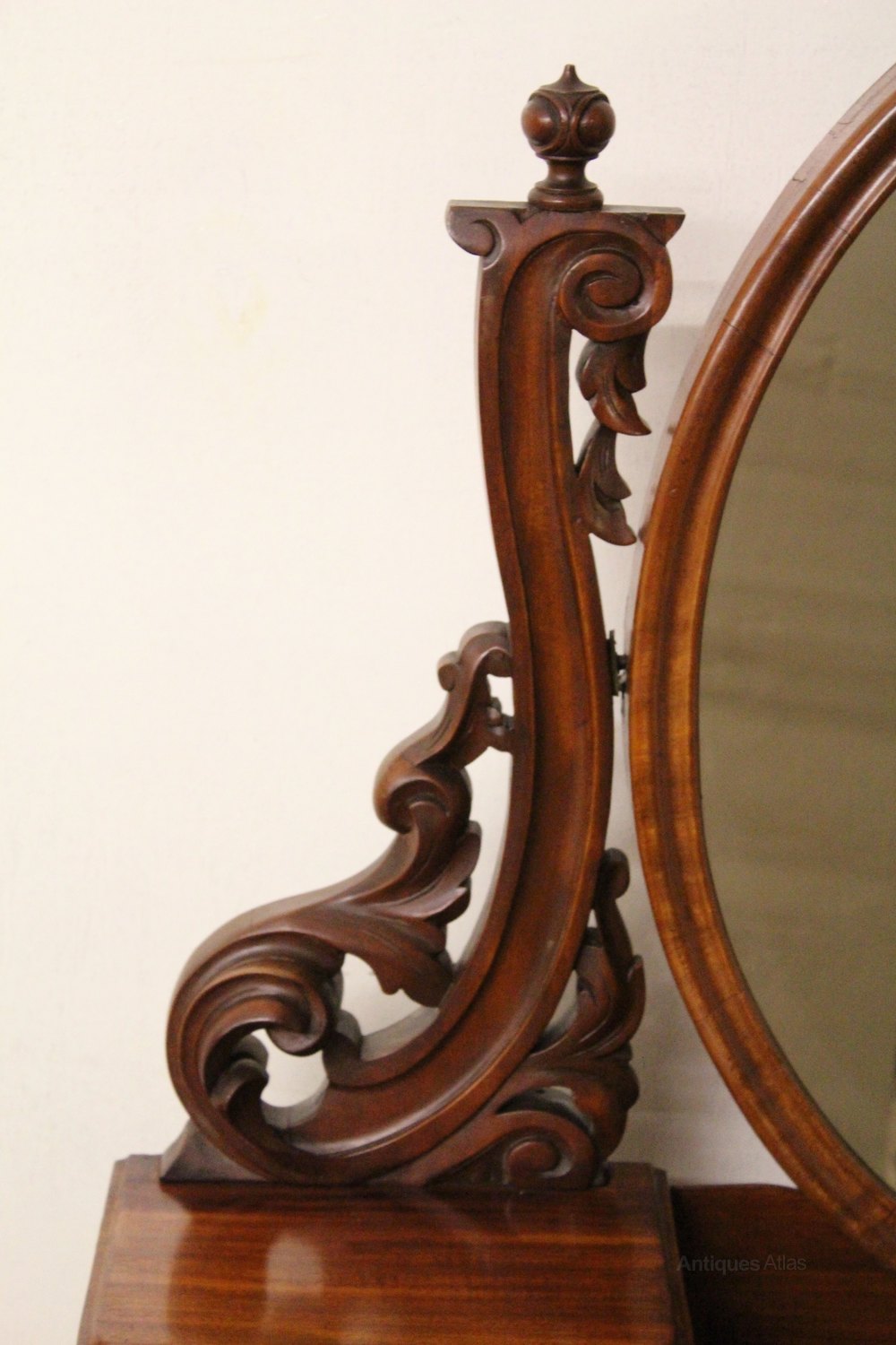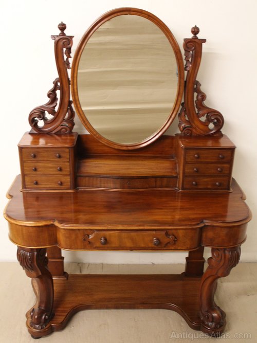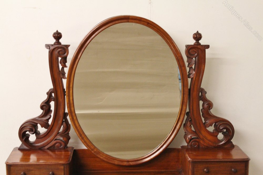 A wonderful Duchess dressing table from the height of the Victorian era. Of very good construction from a good grade of mahogany, which has now developed a lovely depth of colour and patina. The oval dressing mirror is adjustable and is held by two carved, scrolling, supports. Beneath this is a central antique jewellery box with lift-up lid. which is flanked by a series of small jewellery drawers. The base section has a single drawer to the freeze. All standing on strong carved, front cabriole legs. This lovely dressing table is offered for sale in excellent original condition, ready to go straight into the home.