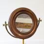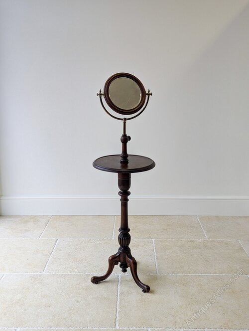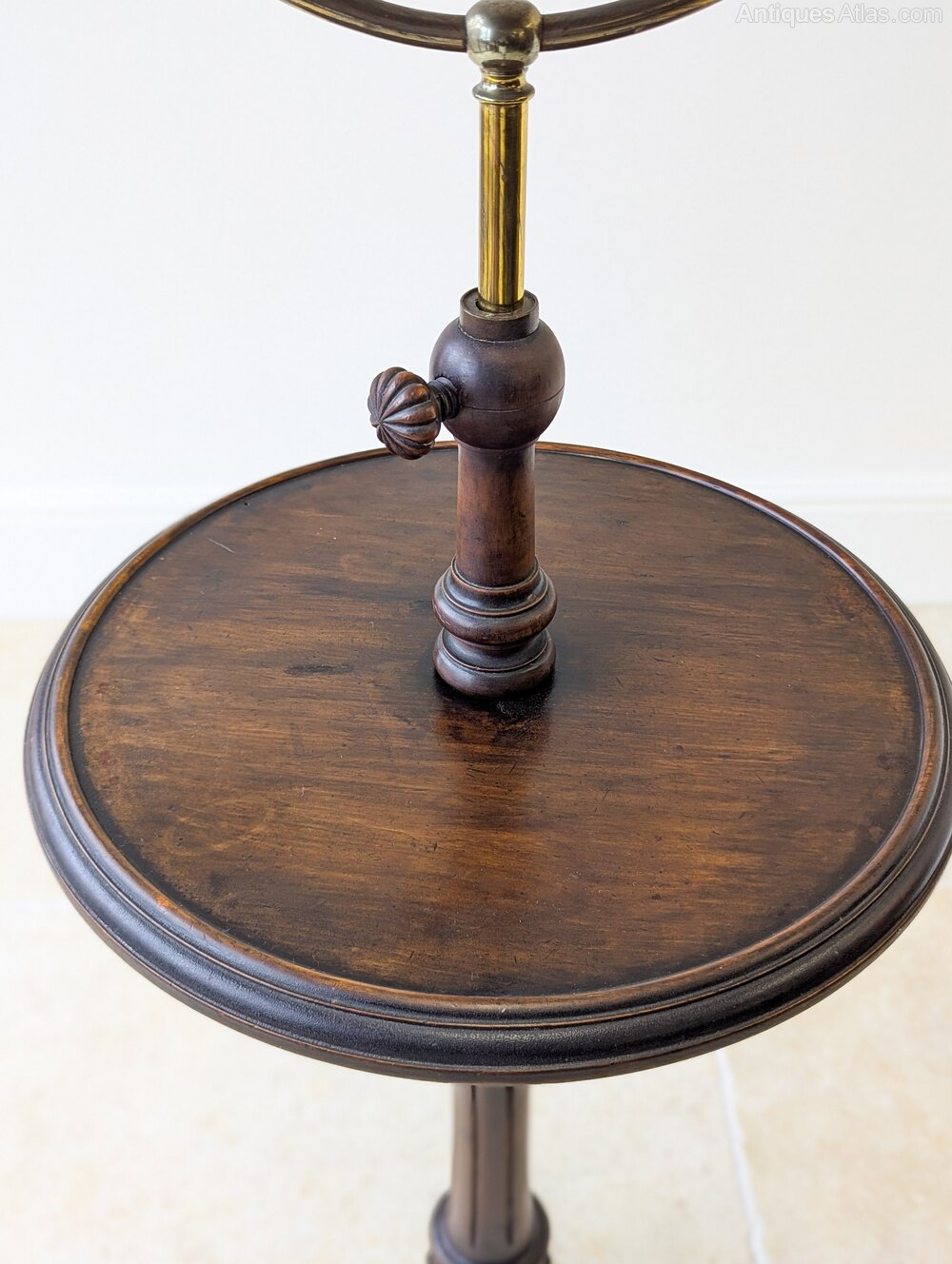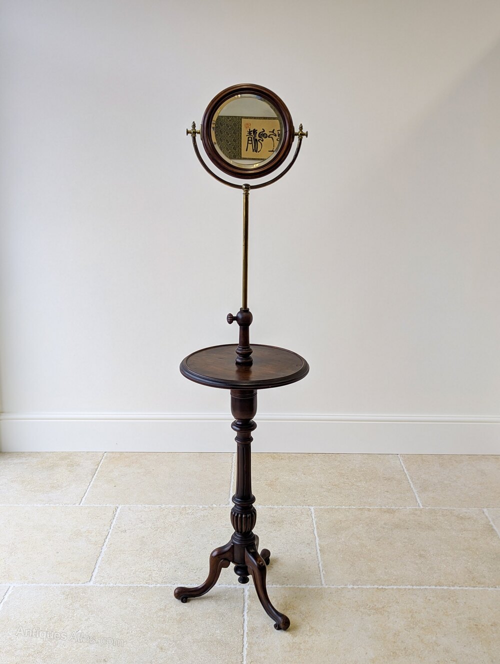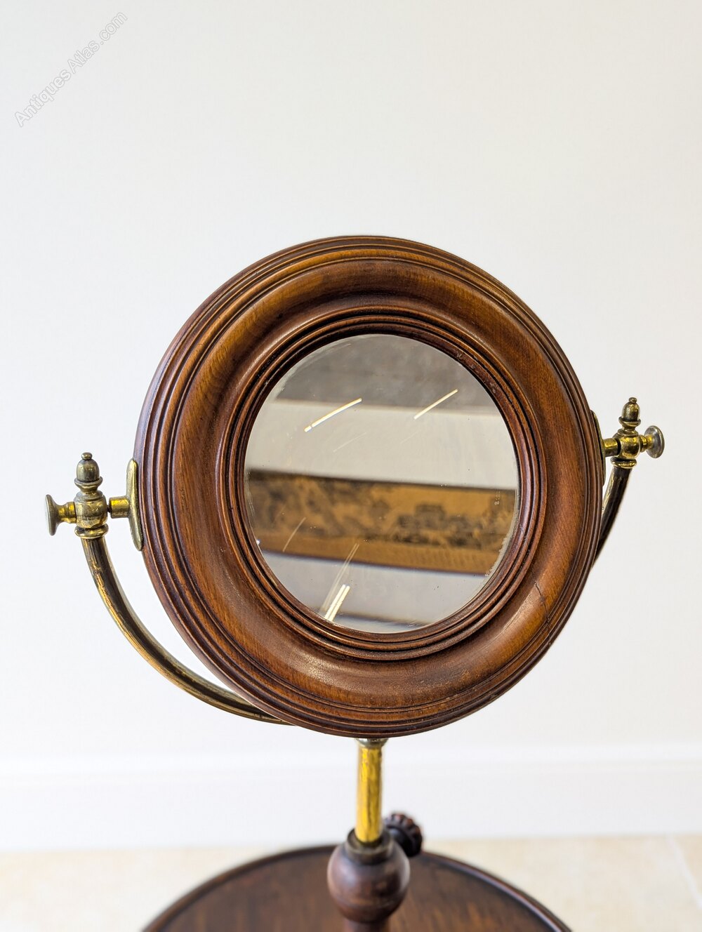 A late Victorian mahogany shaving stand, crafted in the elegant Regency Revival style. The circular double-sided mirror is set within a mahogany frame, with one side offering standard reflection and the other magnification. It is mounted on an adjustable brass support, the height controlled by a finely carved wooden knob to the stem.
