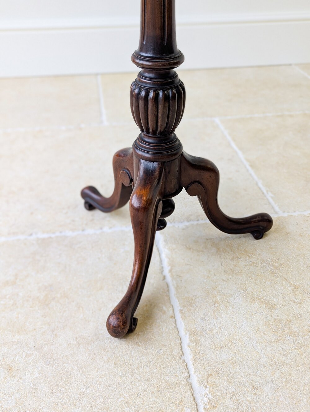 Below, a rotating circular platform rests on a turned column with a fluted baluster, standing on cabriole tripod legs with scroll feet. A versatile and particularly decorative piece for a bedroom or dressing room.
