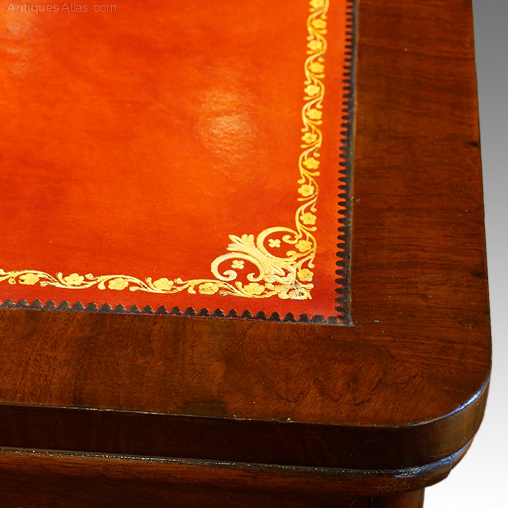 The top has a hand dyed and gilt tooled antiqued red leather hide.