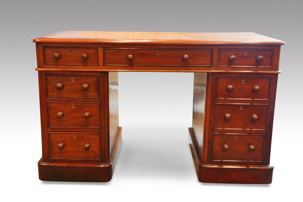 The desk has 3 drawers along the top and 3 drawers to each pedestal.The drawers are cock-beaded and have the original turned mahogany handles and lock and key.