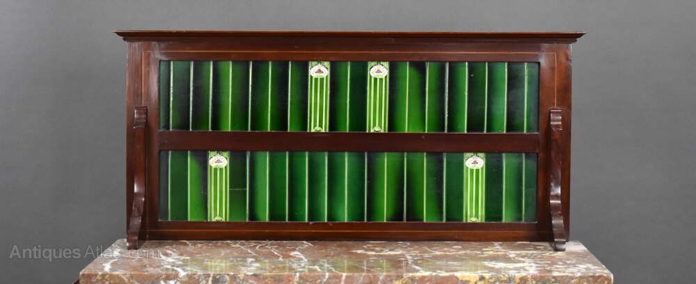 A charming late 19th-century Victorian wash stand in mahogany, featuring a beautifully veined marble top and an eye-catching tiled back. The upper section is fitted with striking green Art Nouveau tiles, adding a decorative flourish. Below, a double-door cupboard with inlaid panel decoration provides practical storage, flanked by stylised towel rails on either side. Raised on elegant tapering legs with original castors, this piece blends function and timeless style, ideal as a bathroom vanity, sideboard, or decorative console.