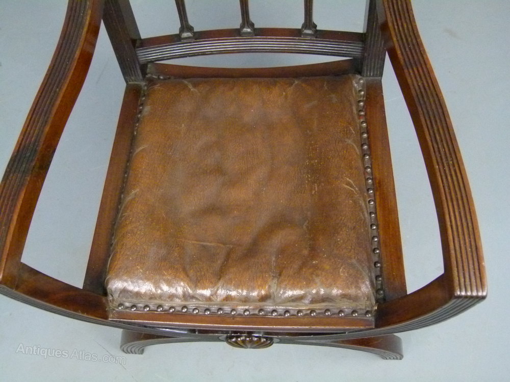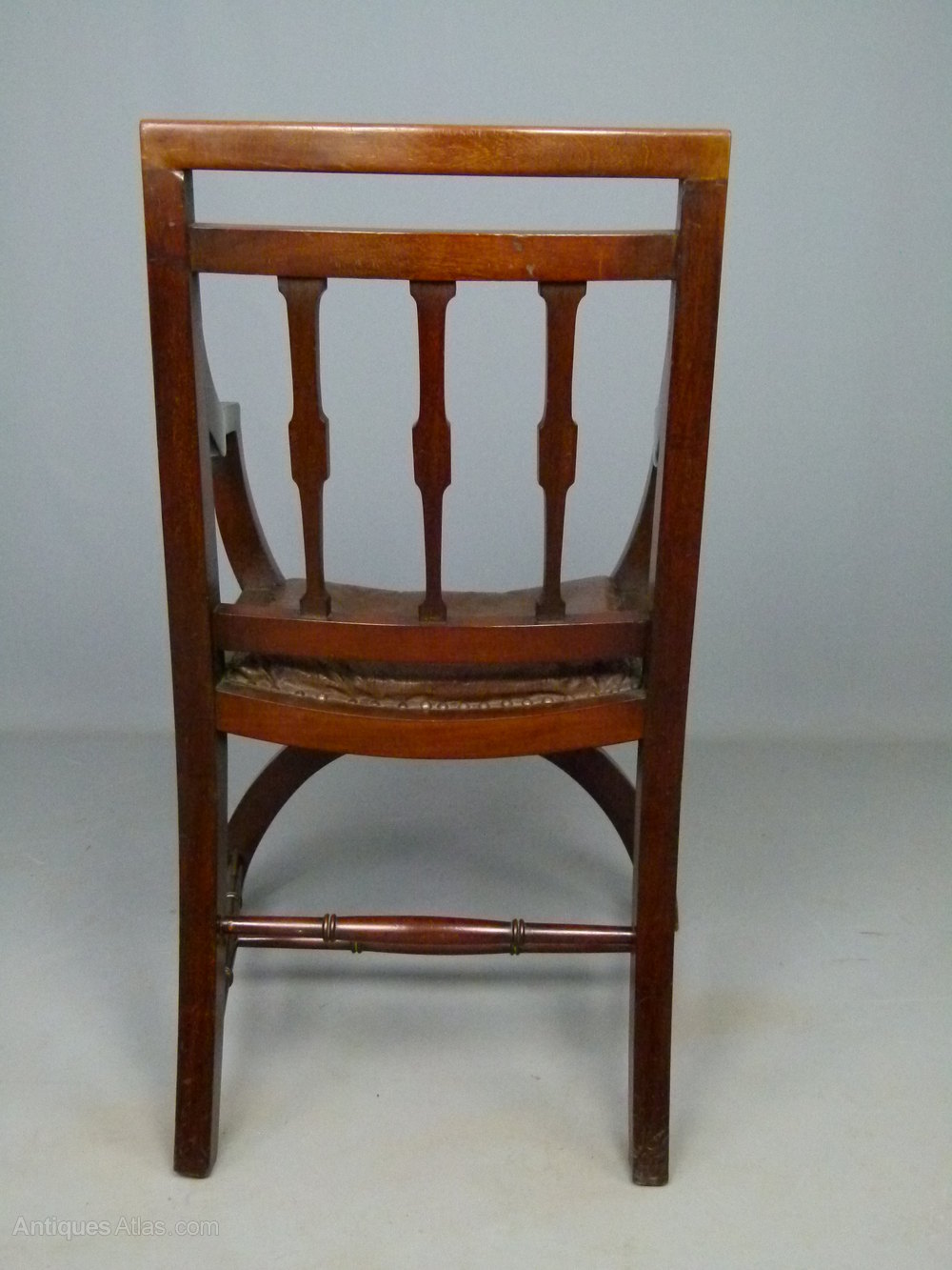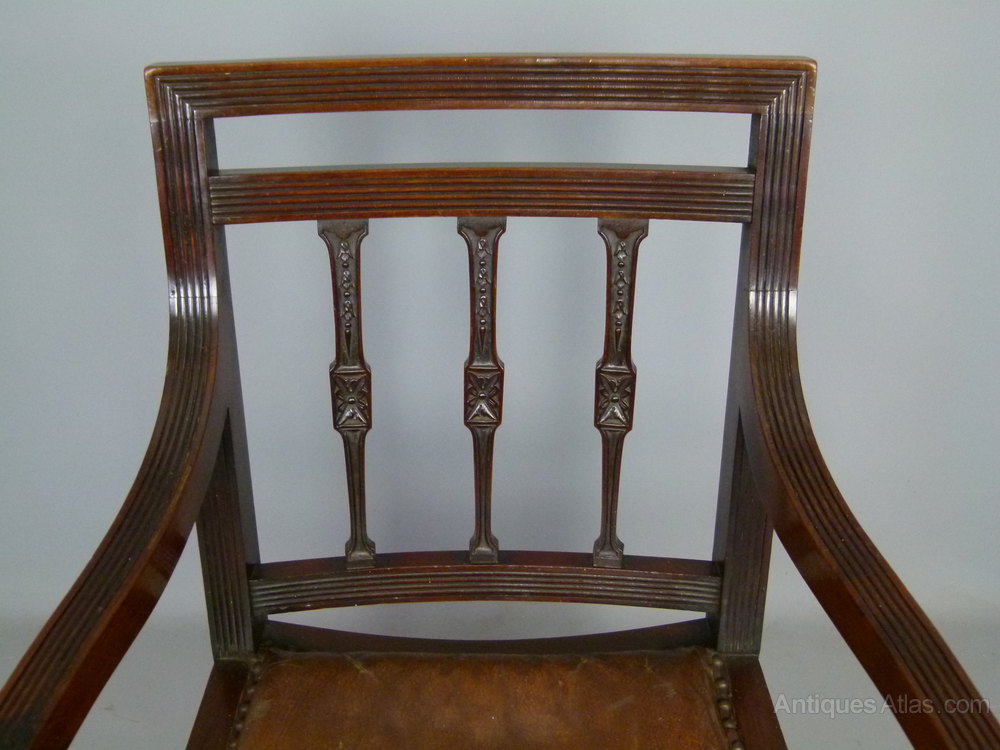 Having a reeded top crest rail, with reeded uprights and reeded outswept arm supports. The splat back has very pretty carved bell-flower motifs.