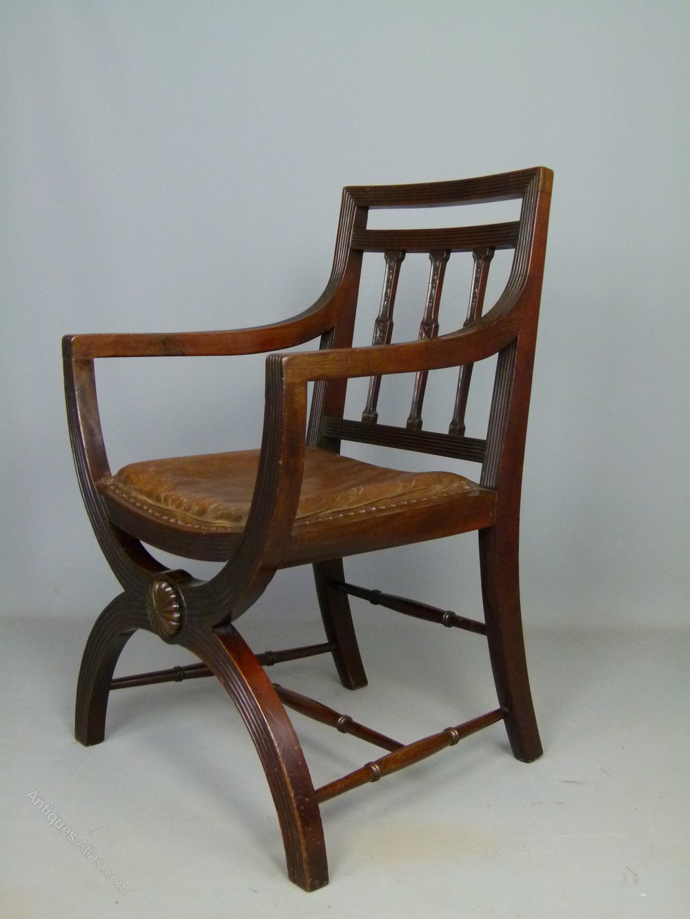 A very handsome and stylish mahogany arm chair with a slightly later, faux tan leather (Rexine) studded seat.