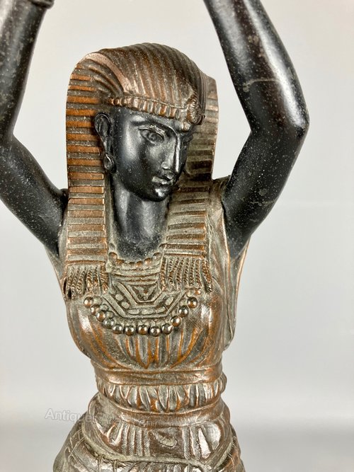 A great late Victorian patinated spelter candlestick, dating to circa 1880, modelled as a Nubian water carrier in Ancient Egyptian Dress. I think it's great fun and very well modelled. Offered in pretty good condition, commensurate with age, with good colouring, there is a small crack to the base, as can be seen in the last photo, but this isn't particularly noticeable and isn't structurally a problem. It measures 39cm tall. The price includes U.K. postage.