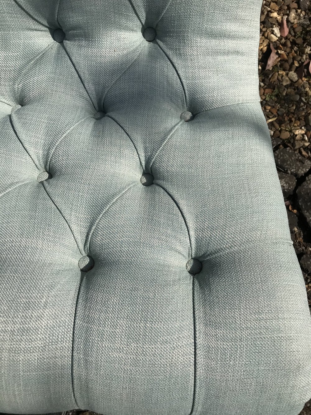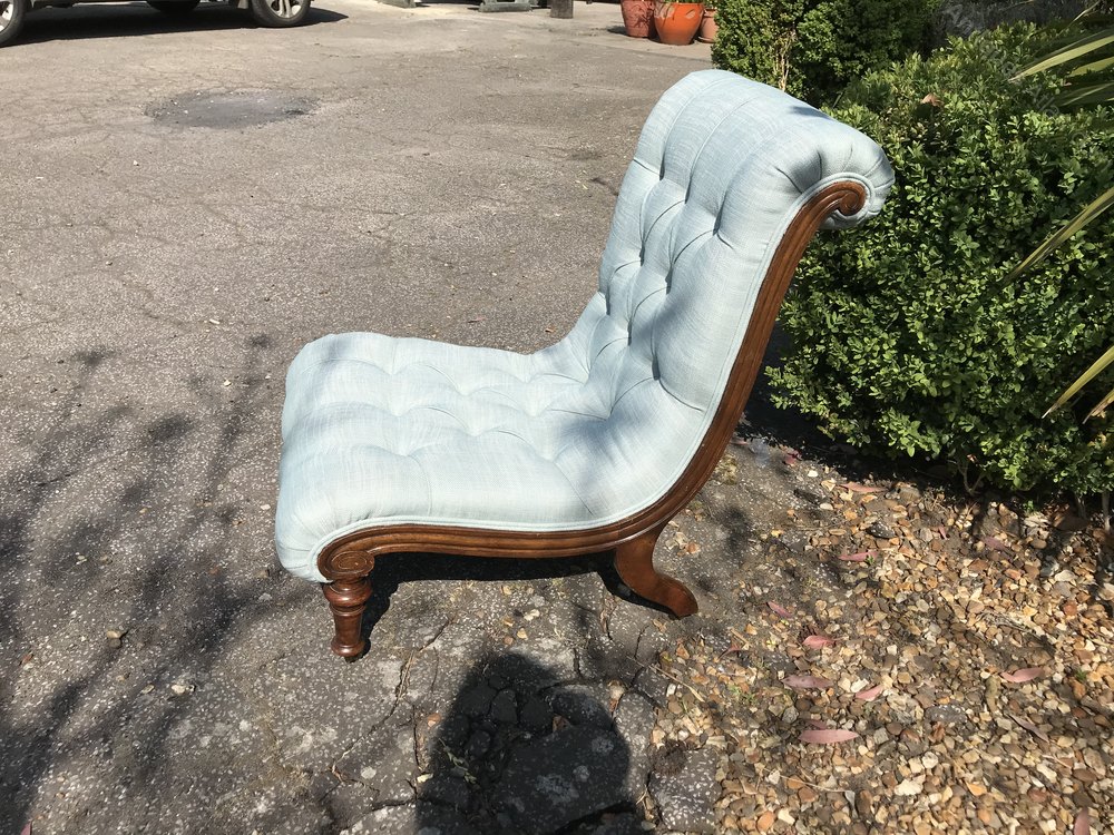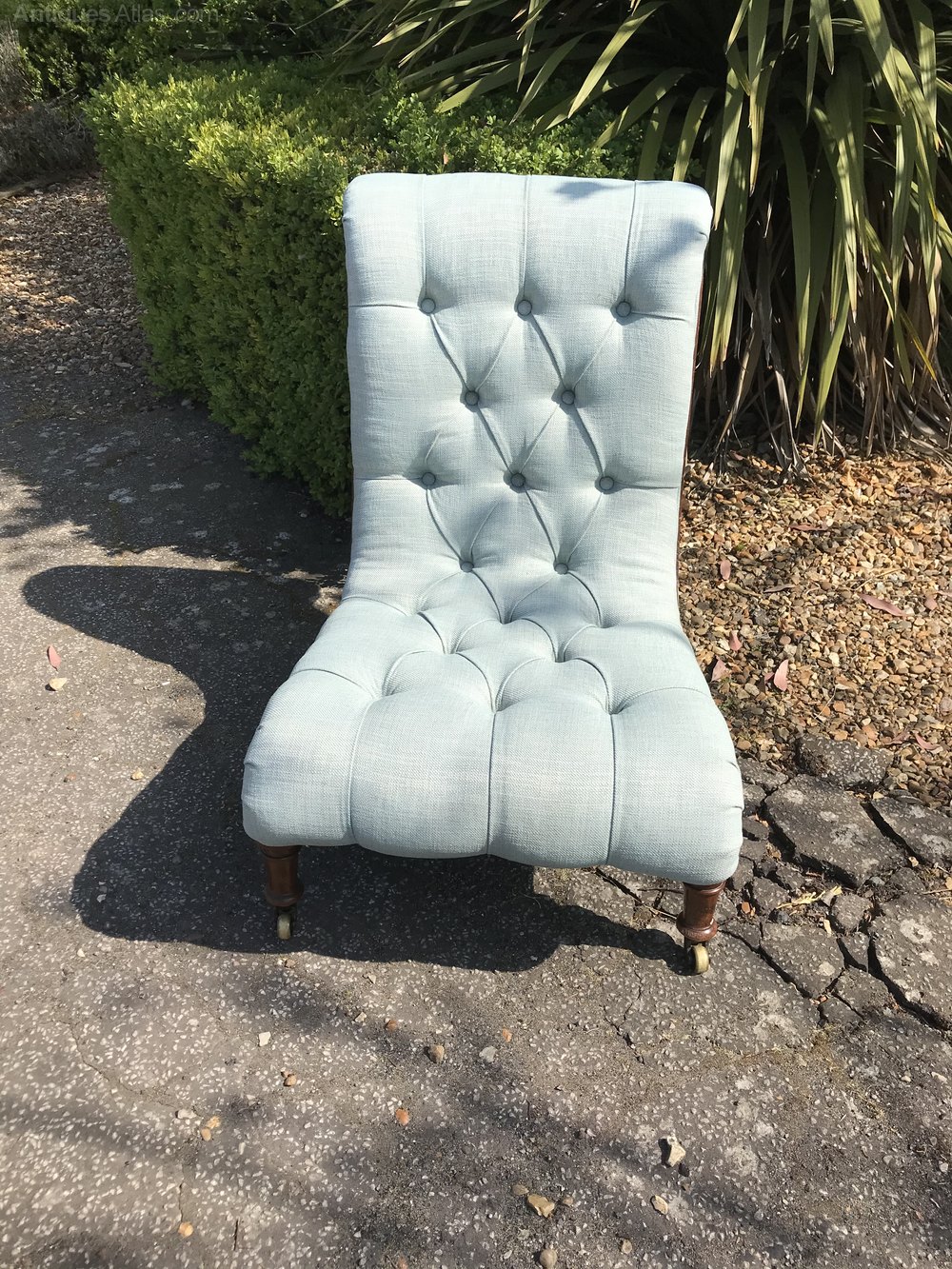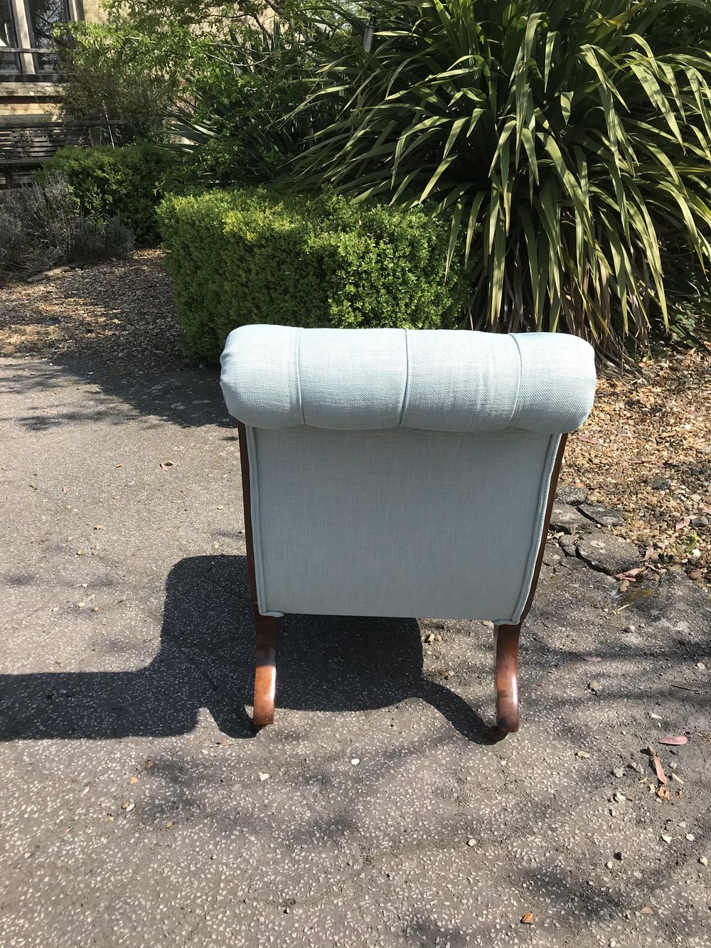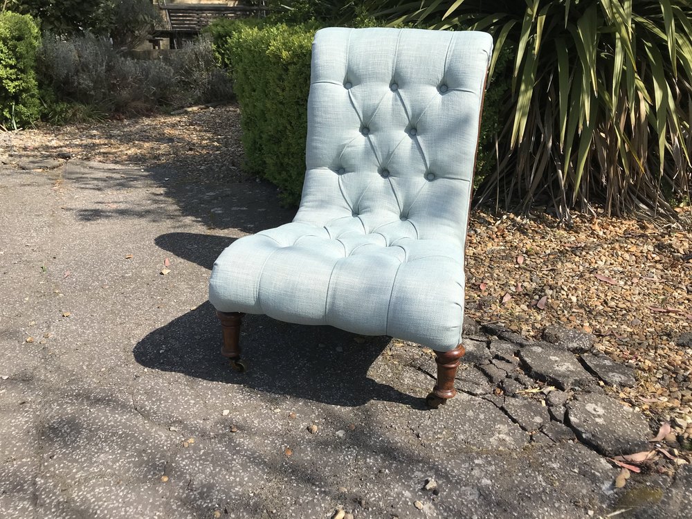 Elegant Victorian nursing chair with mahogany legs finished with period castors. Newly upholstered to a high standard with buttoning detail and piping in quality John Lewis fabric