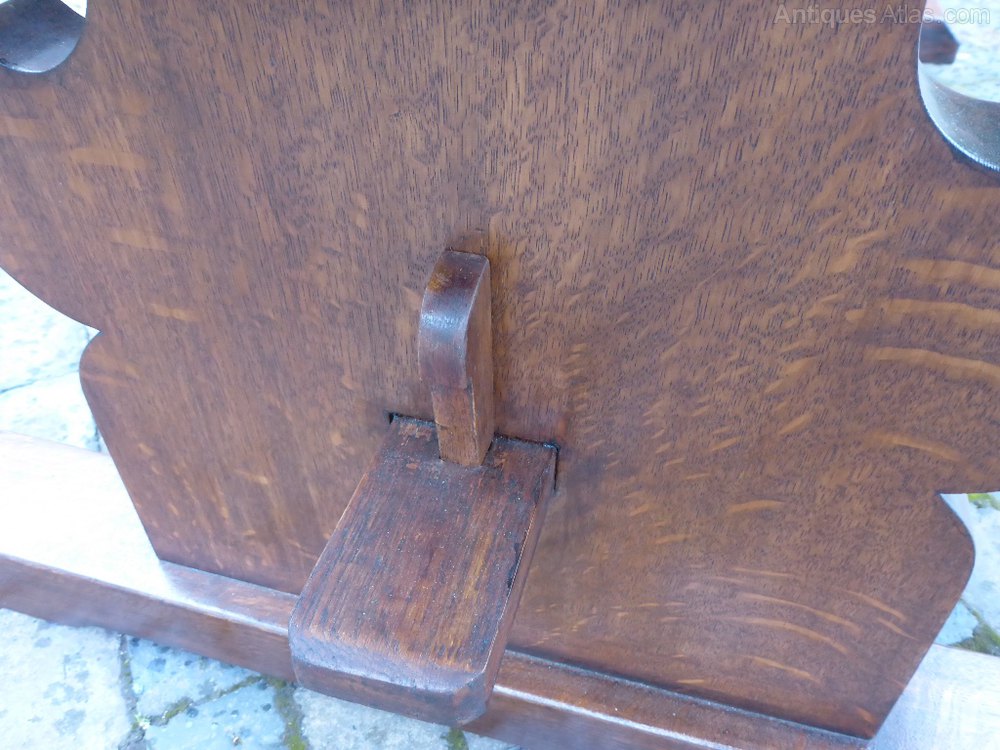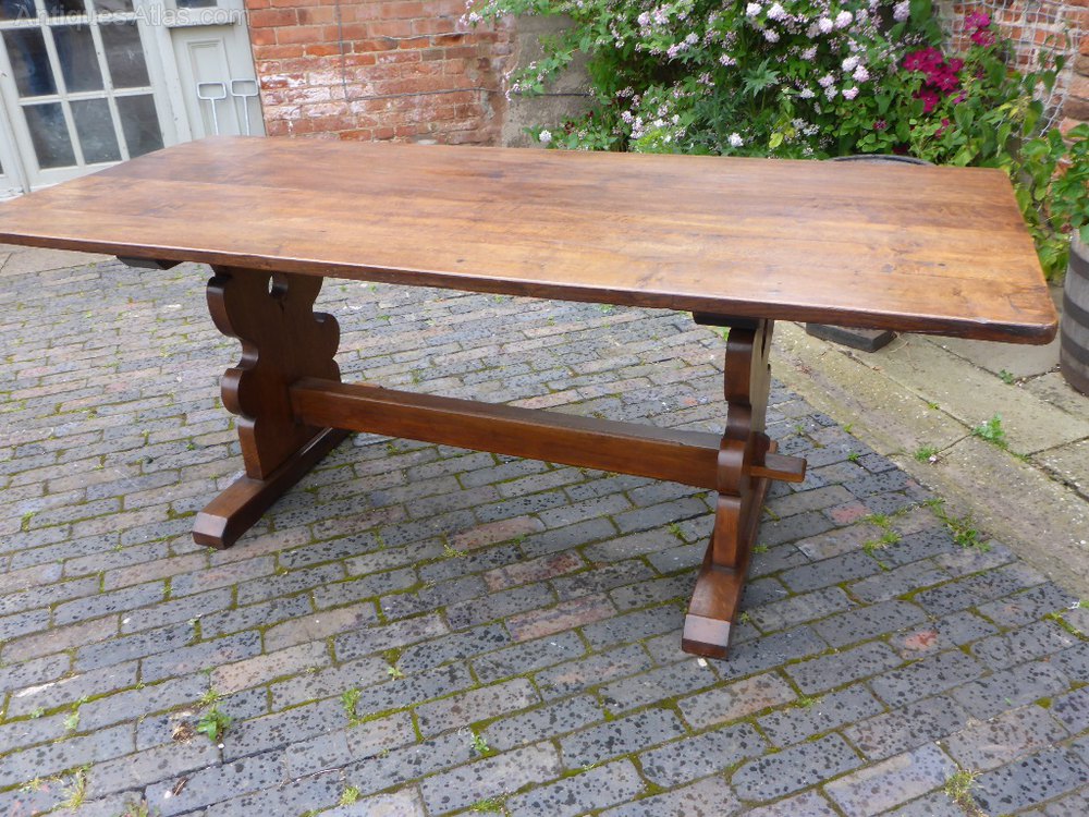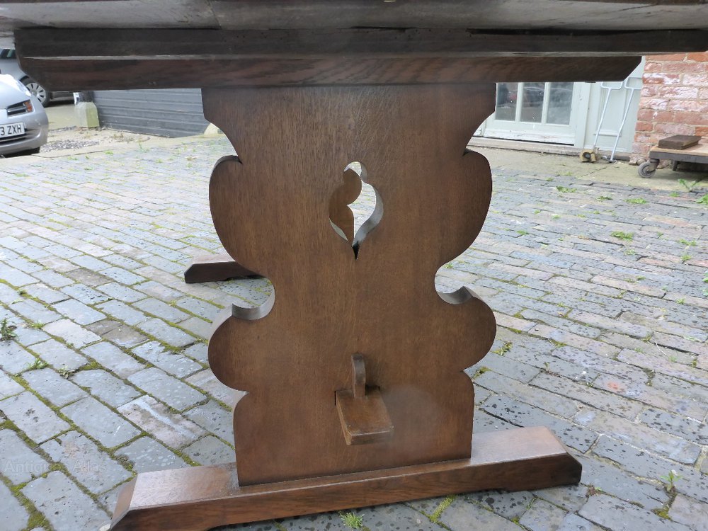 A Heavy late Victorian Refectory table in Oak, shaped ends with a central stretcher pegged at the ends, 5 plank top, good colour.
