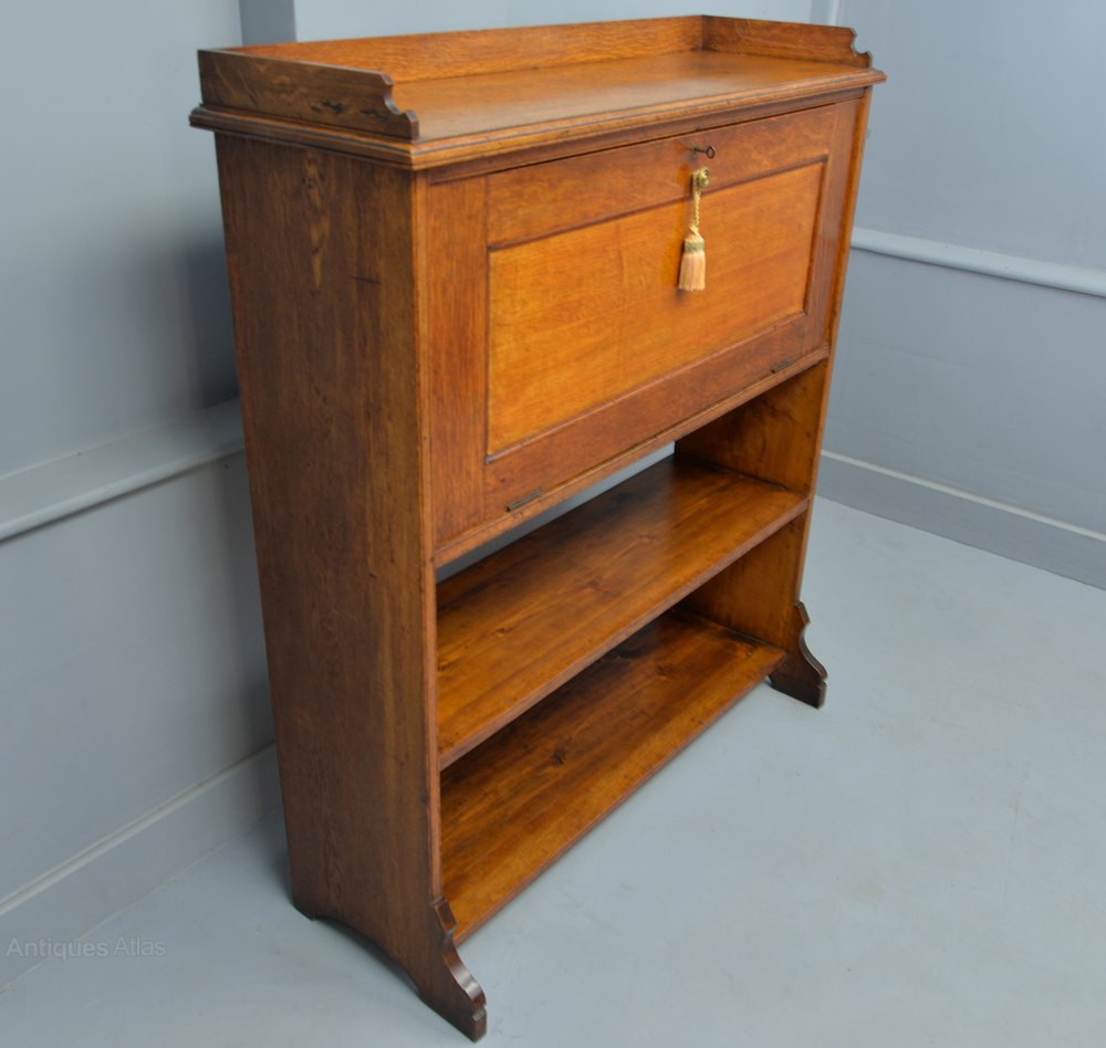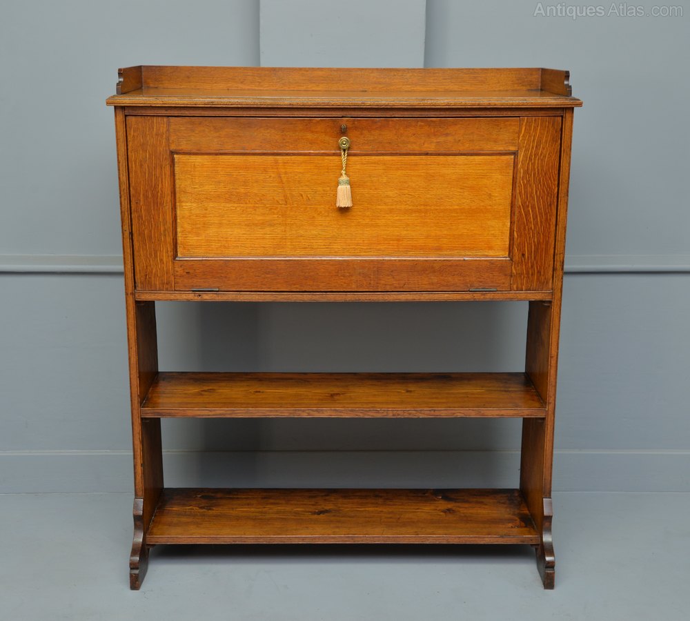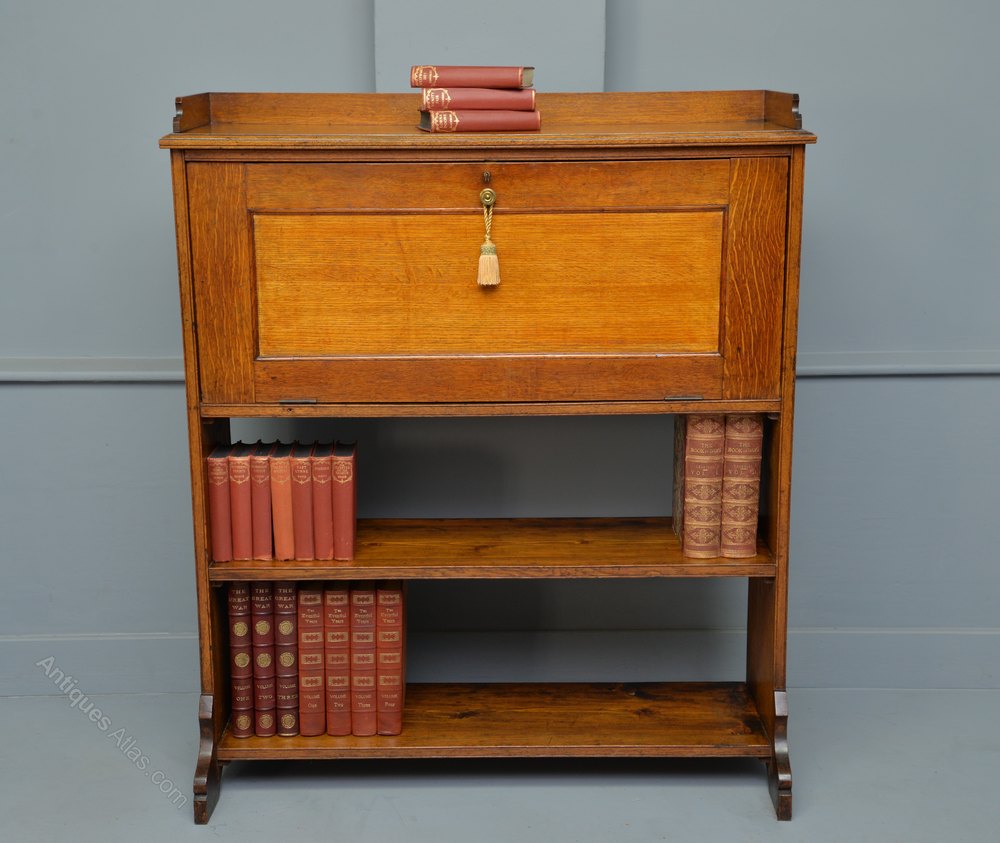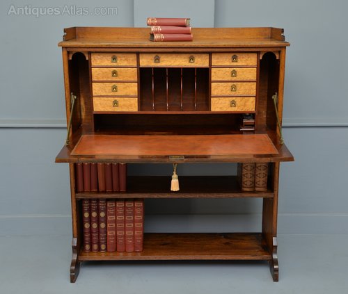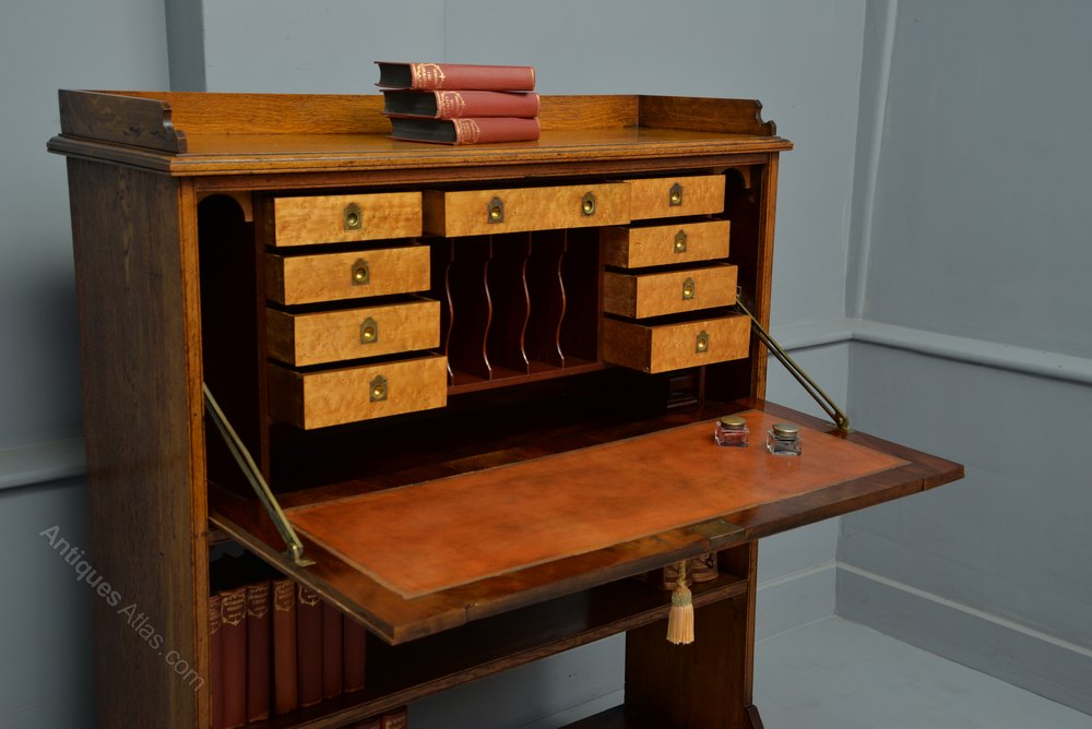 Made from oak, and from the outside quite a simple design which belies it`s interior. The fall-front opens to reveal a high quality fitted interior, with an arrangement of eight drawers, fronted with the most stunning satin-maple, and flush brass handles. To the centre are five tall shaped stationary compartments. Below the drawers is a pull-out inkwell, with the original ink bottles. With more storage to the bottom and sides. The two lower drawers and the long central drawer feature a secret way of opening.