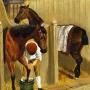 At the rear, two huntsmen in scarlet coats and black riding hats converse, adding a touch of nobility and compositional balance. The light, filtering softly through the stable, plays across flank and straw, creating a warm, atmospheric harmony typical of late Victorian sporting art.