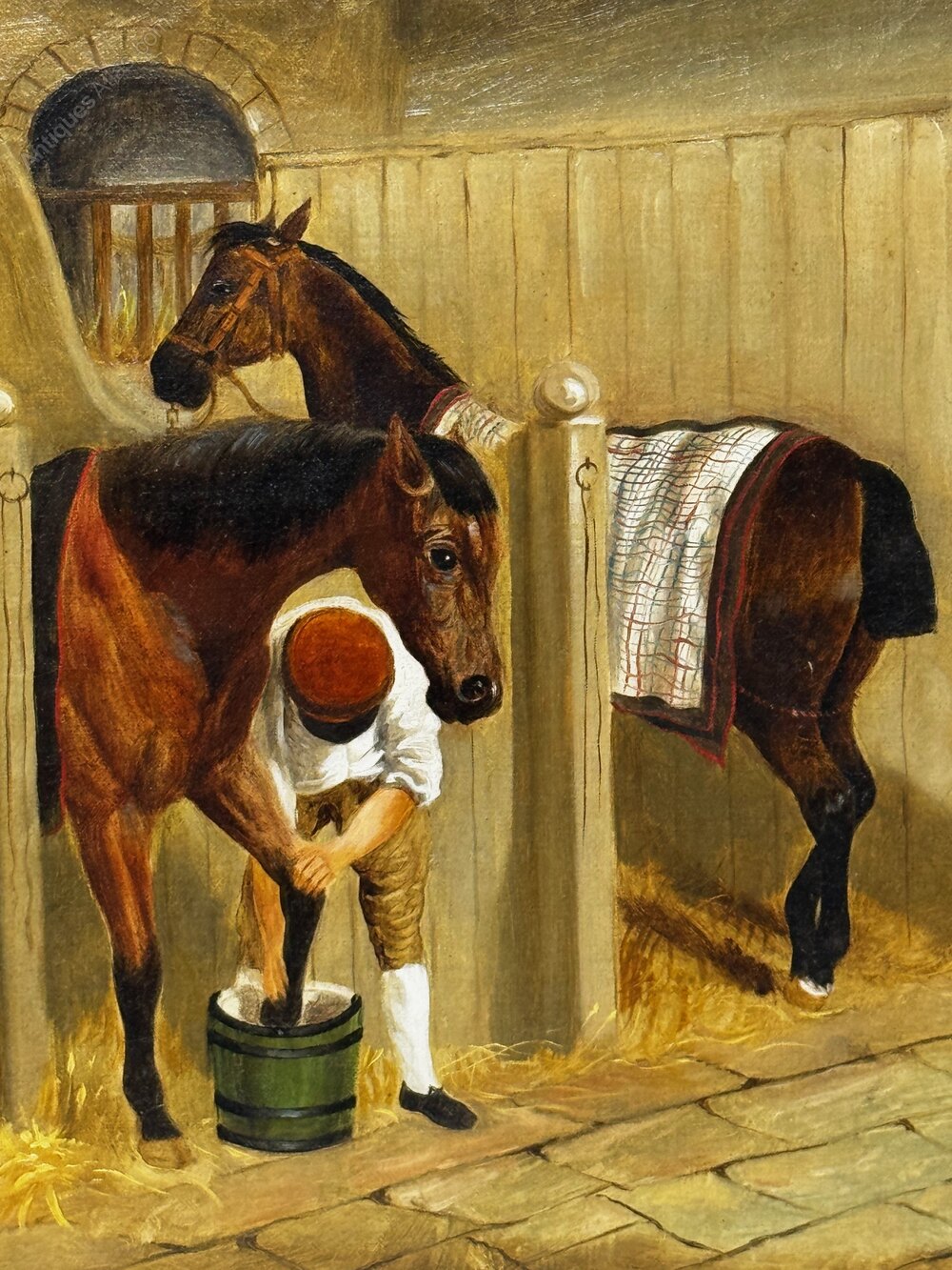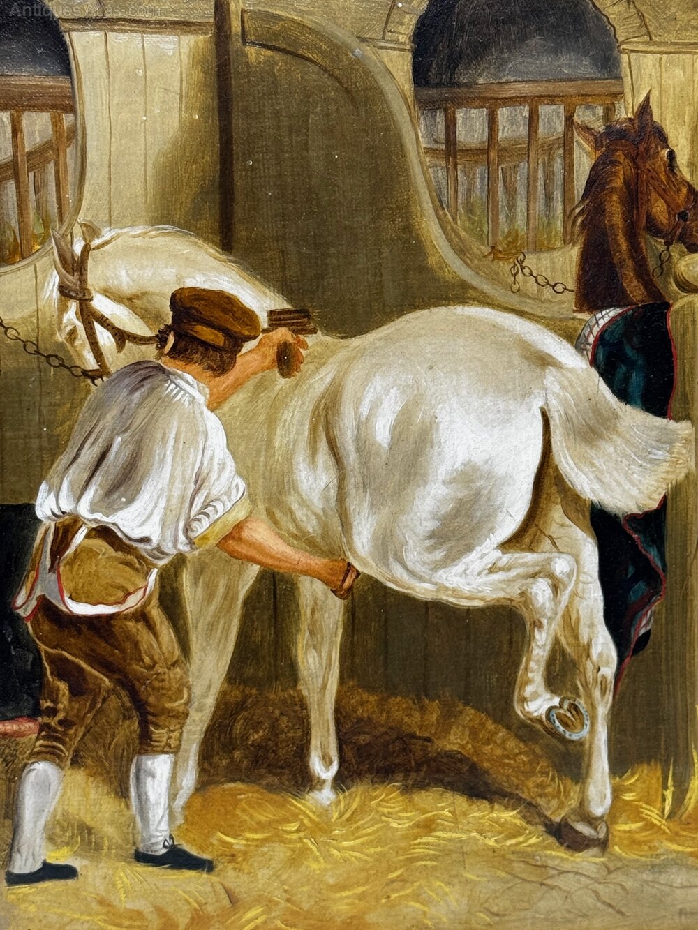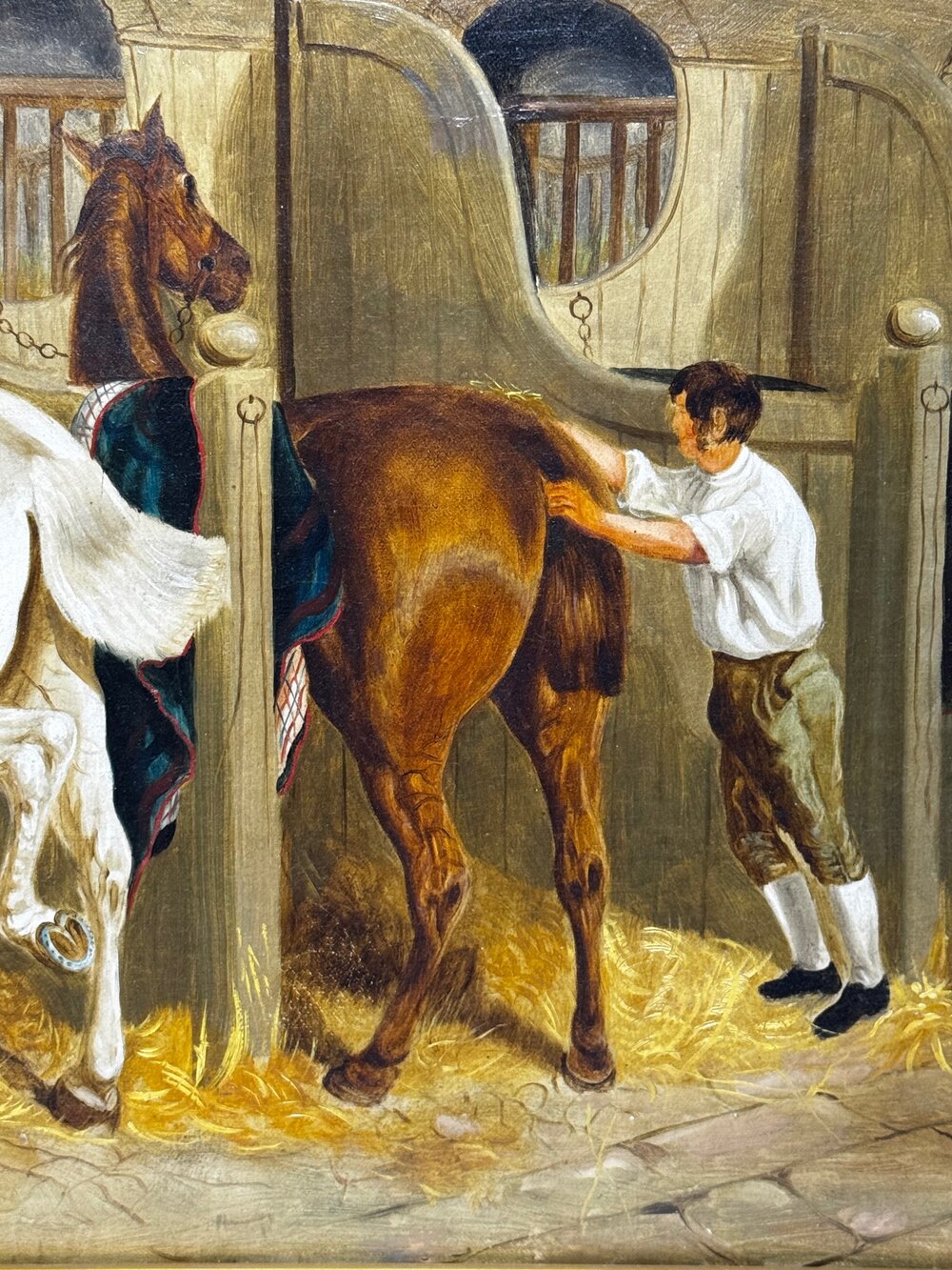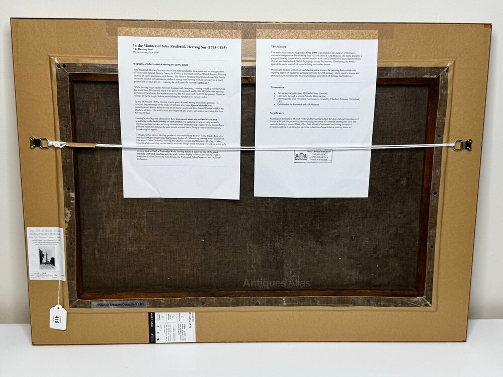 Herring’s influence endured throughout the later Victorian period, inspiring generations of painters to emulate his masterly compositions of horses, stables, and rural life. This unsigned work, painted in his manner around 1900, demonstrates how his legacy continued to shape British sporting art at the turn of the century.