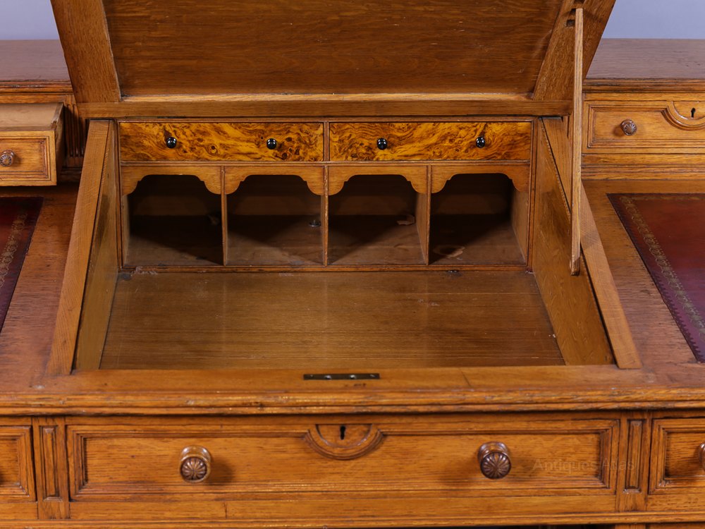 A Superb Quality Victorian Desk in Golden Oak, it has eight drawers to the front ,the central one is a dummy drawer and two small drawers to the top the writing slope lifts upwards to reveal four pidgeon holes and two more small drawers, the quality is amazing all the wooden handles are carved and are original, the drawer fronts the sides and back of the desk are panelled,there are two doors at the back of the desk, the top has three burgundy leather inserts, the condition is excellent with an attractive pale or golden colour to the Oak, it is in three sections for transport and stands on concealed castors