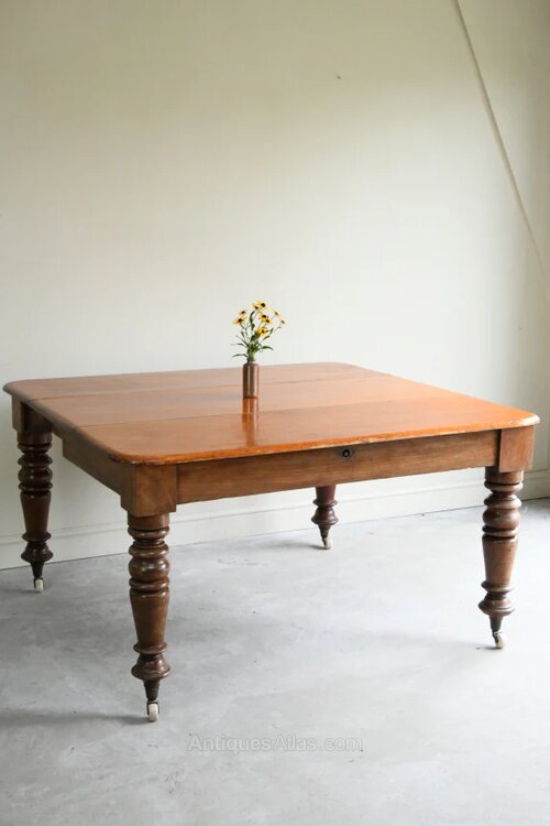 Condition Solid condition, later varnish finish to the table top and extension leaf, would benefit from the top being stripped and refinished as the finish is worn and patchy.