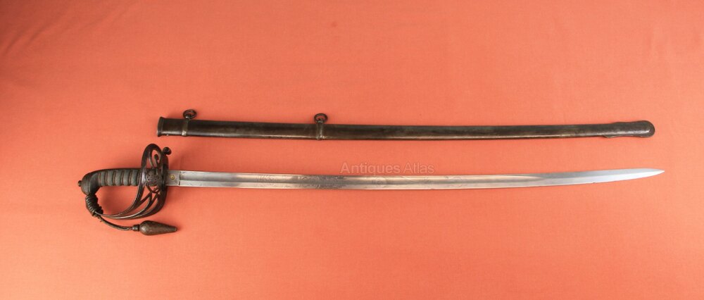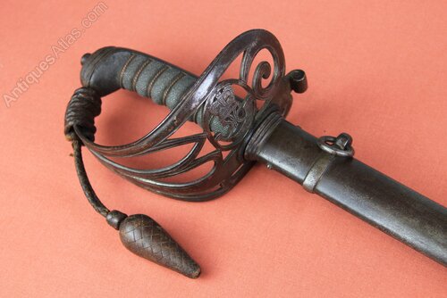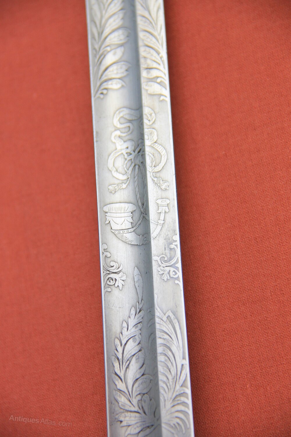 Victorian Rifle Officers sword in its original steel scabbard and with its original knot. Has a pierced guard with crown and bugle and with a copper wire bound shagreen grip. Engraved blade with trophies of Arms and Foliage and with original owners initials of GL in script. Has a clean blade. In good overall condition with general rust staining the the exterior and no dents to scabbard. Has a tightly fixed hilt.