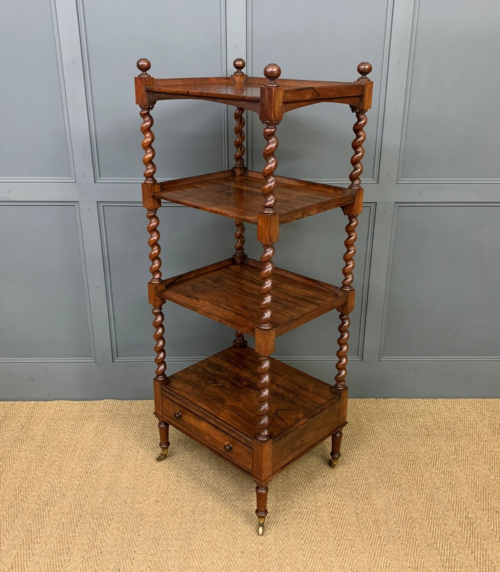 A substantial early Victorian period rosewood whatnot. Of very good construction in solid rosewood with 4 tiers supported by barley sugar twist columns. The bottom tier with a drawer. All standing on turned legs terminating in original solid brass caps and castors. Cleaned and waxed in our workshops and now offered for sale in excellent condition with a great colour and patina.