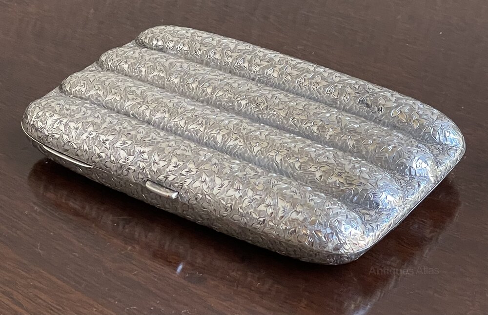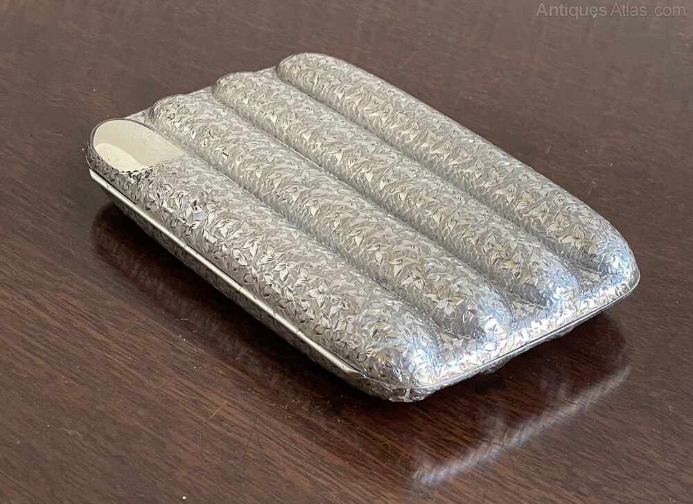 A superb quality Victorian silver four section cigar case or box beautifully engraved with floral leaves and scrolls. The case is spring loaded opening to reveal a gilt interior. Fully hallmarked for Birmingham 1897 by Joseph Gloster. The cartouche is vacant.