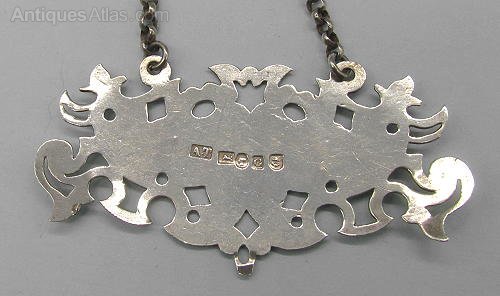 Very ornate decanter label or bottle ticket by Alfred Taylor. It's fully hallmarked for Birmingham 1855 and is in superb condition. The fused link chain appears original. The label measures 2 1/2" x 1 1/4".