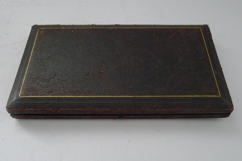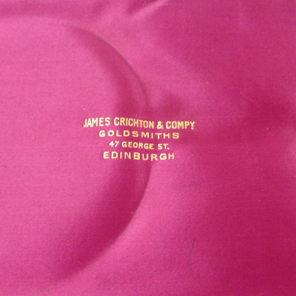 The case has clearly done a wonderful job protecting this piece and has surface wear and tear. The interior lined in velvet and silk, the silk gold printed " James Crichton & Compy. / Goldsmiths / 47 George St., Edinburgh.