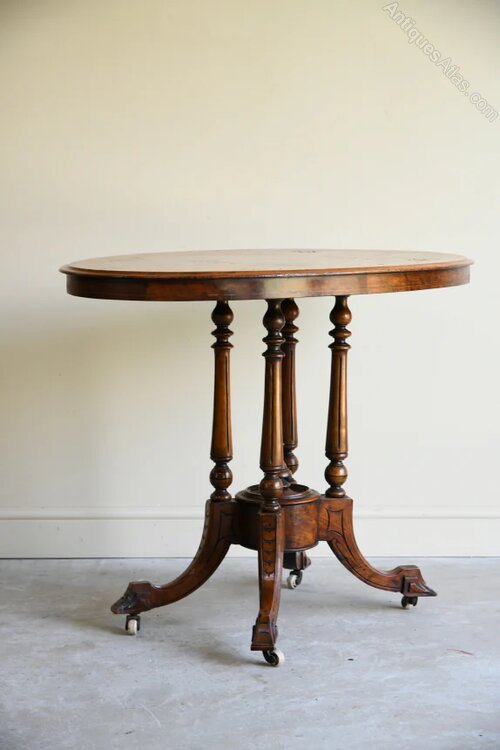 Victorian Walnut Centre Table. Antique Victorian walnut occasional table, the oval top with bookmatched walnut veneer and inlaid decoration on four turned columns and splayed feet.