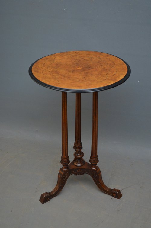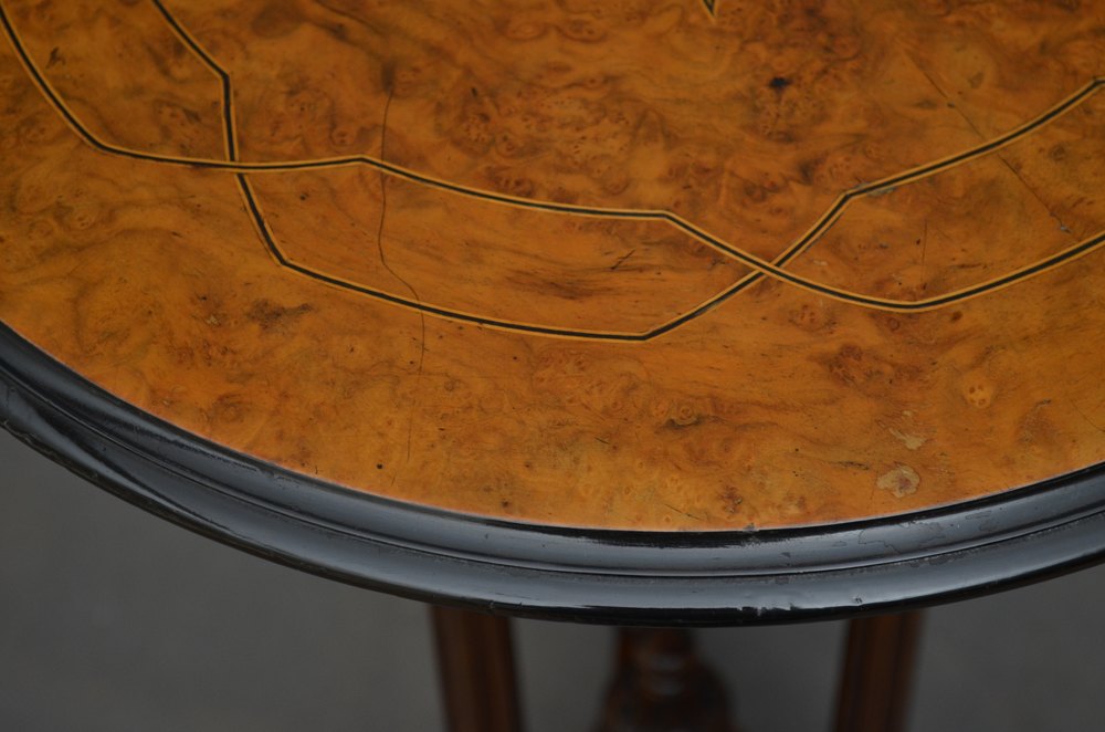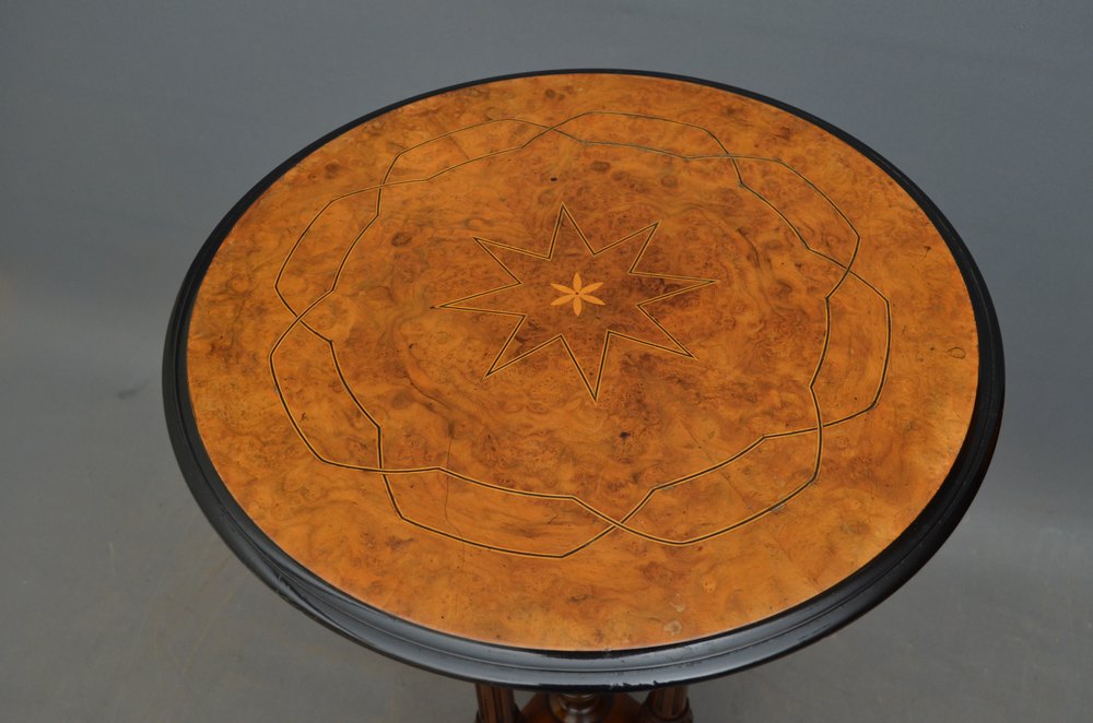 Sn4291 Fine quality Victorian occasional table, having burr walnut top with string inlaid decoration, moulded and ebonised edge and 3 turned, reeded and carved legs terminating in carved and downswept feet. This antique table retains its original finish and antique character, ready to place at home. c1870