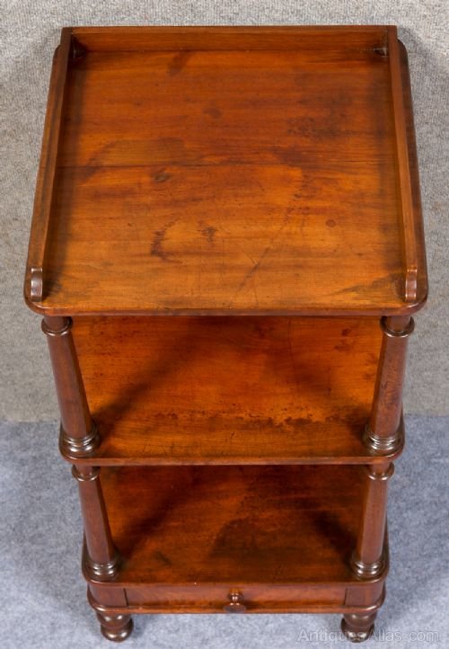 A good quality Victorian figured mahogany 3 tier whatnot having a three quarter gallery top, turned supports and drawer to base and standing on short turned feet. Delivery to most of U.K. mainland £42. Dimensions :- Height...37.5''/ 95cm. Width...18''/ 46cm. Depth...17.5''/ 44cm.