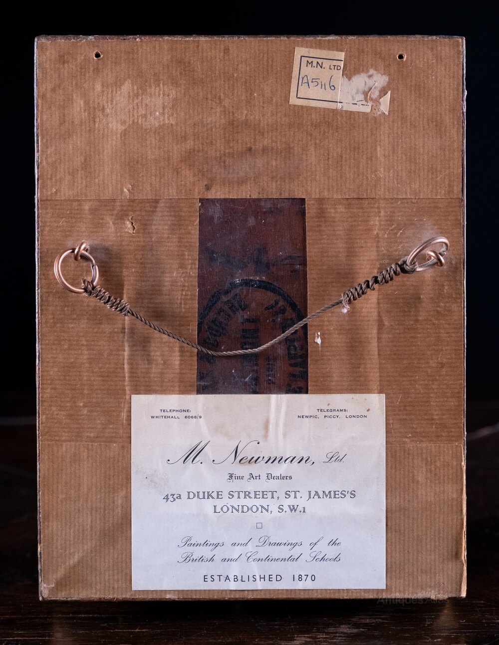 Label for 'M. Newman Ltd, Fine Art Dealers of 43a Duke Street, London' verso. Illegible stamp to the board from which only 'Paris' and 'Lafitte' is legible, the beginning of the stamp being obscured by the later London Gallery label. Presumably the stamp is for a gallery situated on the historic street of Rue Laffitte, Paris.