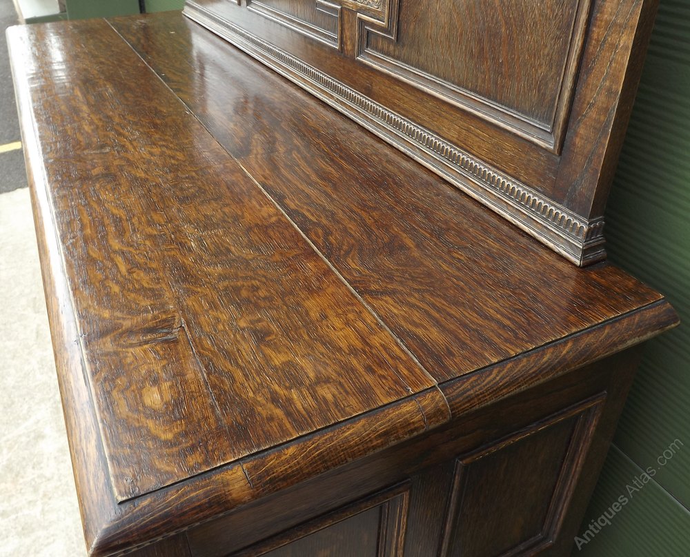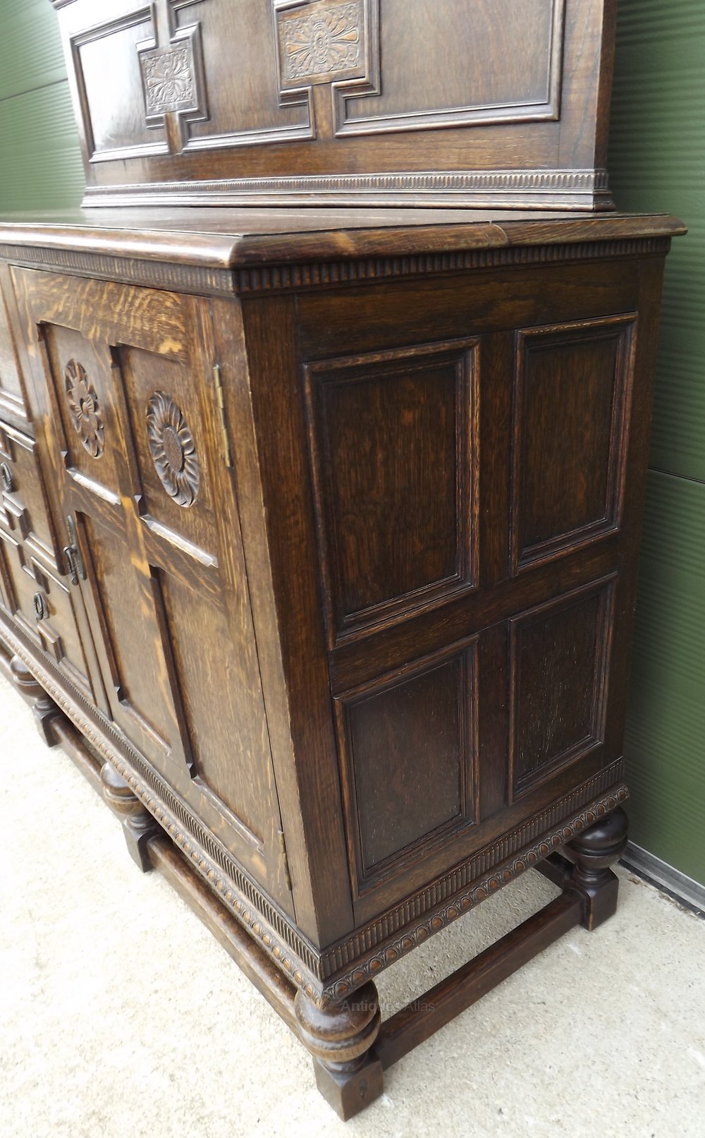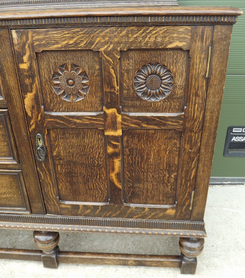 This lovely sideboard dates from around the 1930s, but is older in style. It is constructed from solid oak. The sideboard has a removable panelled back rail with carved decoration. Beneath the top are three central drawers, flanked on either side by a single door cupboard, each with a fixed wooden shelf inisde. The sideboard has panelled sides and doors and the doors have attractive carved decoration. It is supported on six bulbous legs with stetchers in between. The doors and drawers retain their locks, but please note that no keys are present.