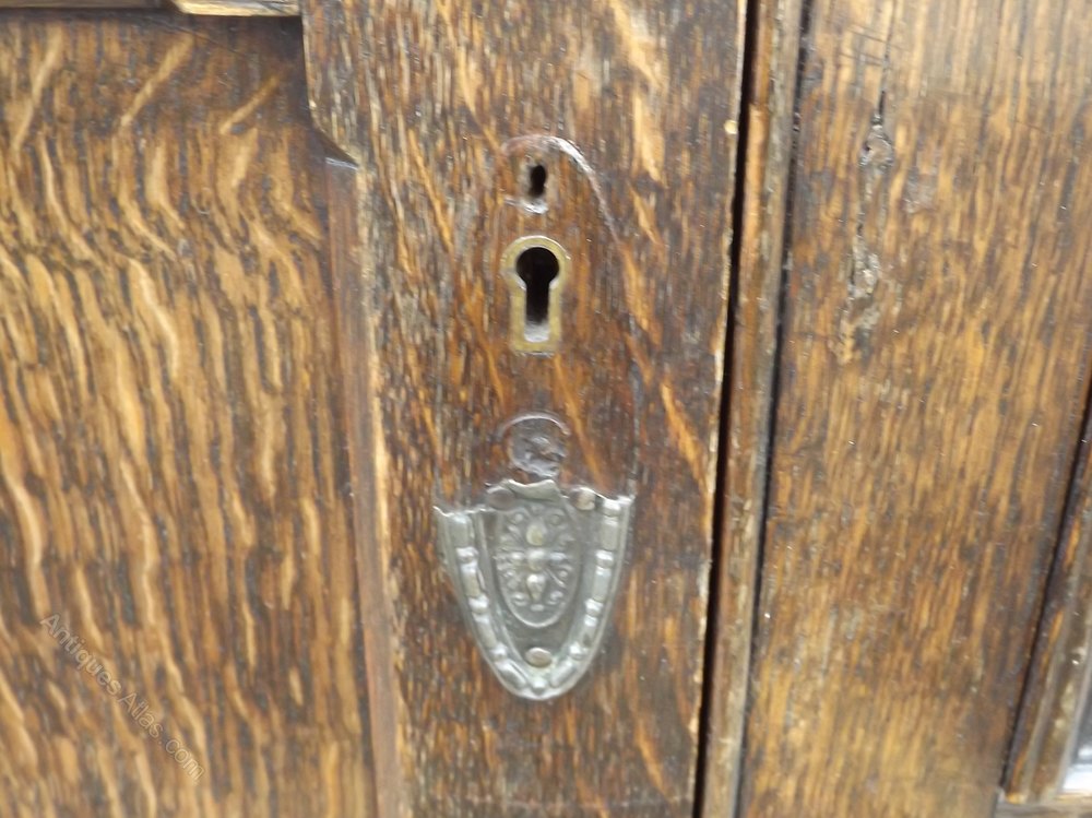 Condition: Overall this handsome piece is in usuable condition but does have some wear consistent with age and use. There is some scuffing and wear to the woodwork as might be expected and the piece is overall a little faded. There is a wood shrinkage split to the top. The cupboard on the left-hand side is missing its handle, the central drawer is missing its escutcheon, and as is mentioned above there are no keys presents. There are some areas of knocking and scuffing to the woodwork around the edges, and the top is scratched.