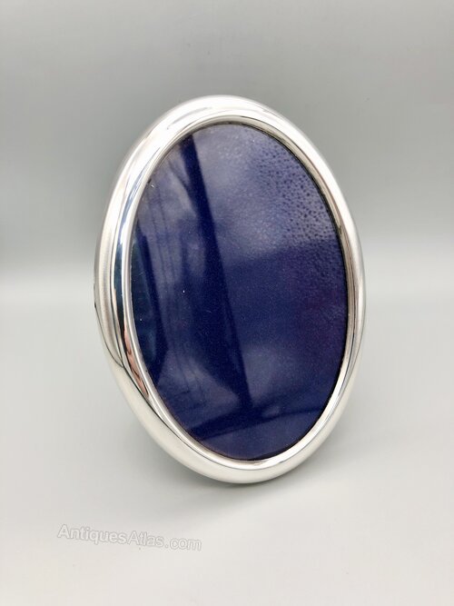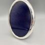 This is a good quality Vintage Sterling Silver Photo Frame. The frame is of upright oval shape with the visible picture size being 5ins x 3.5ins. The back of the frame and the strut are covered in royal blue velvet.