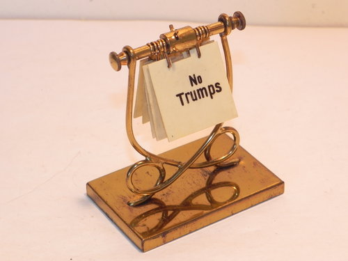 Wonderful and unusual, this brass Bridge Marker is in lovely vintage condition - c. 1930, it has an unusual turning flip over mechanism that turns the suits around and shows the No Trumps Very nice!. Marked DRMG (DRGM - Deutsches Reichsgebrauchsmuster which is a registered design of the German Reich) Standing c. 3" inch tall on a felt base, showing only minor signs commensurate with having been pre-loved, I know this little beauty will not disappoint.