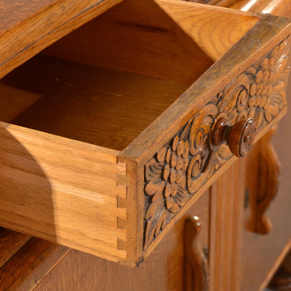 This is a vintage Art Deco sideboard, an English buffet cabinet in oak dating to circa 1940.